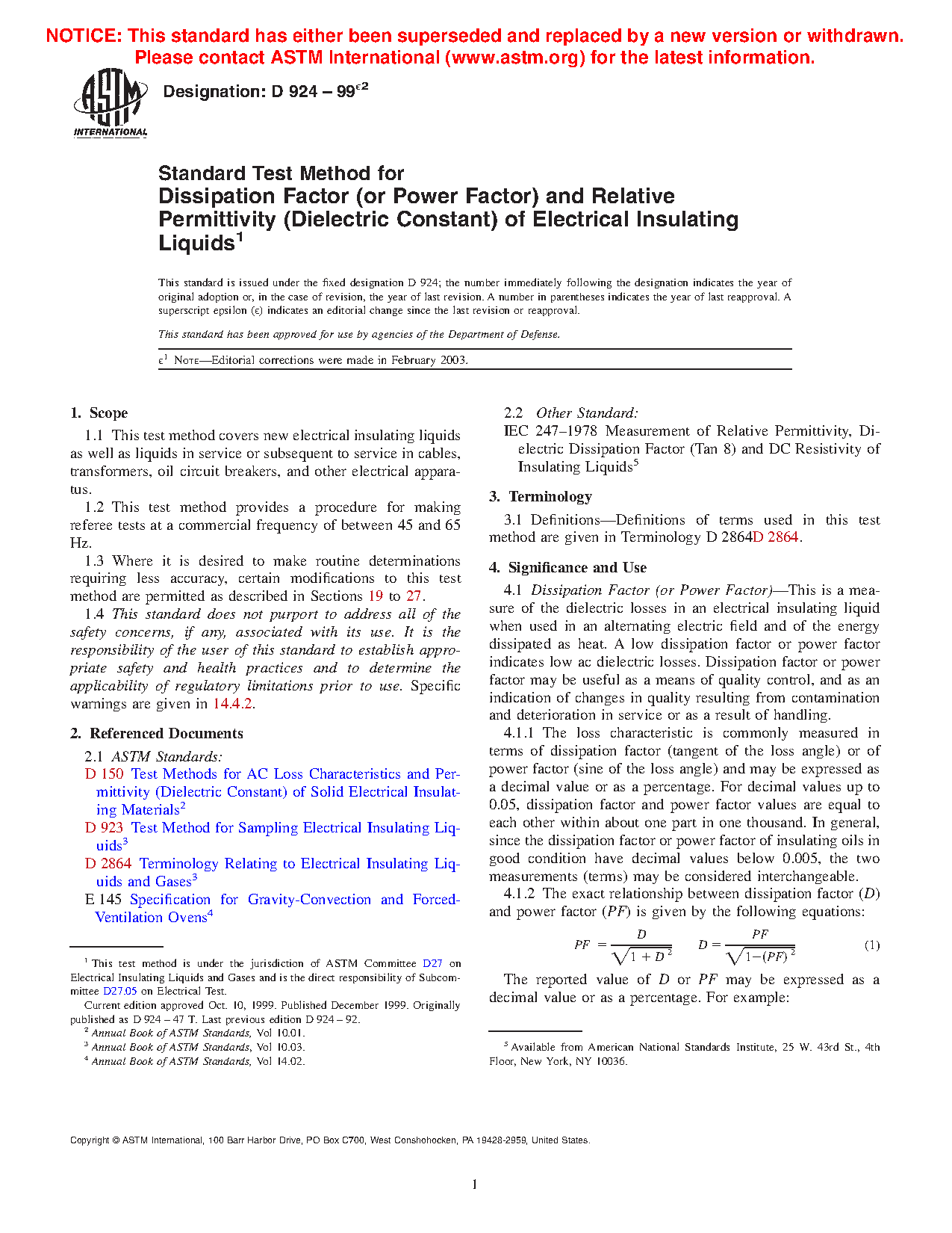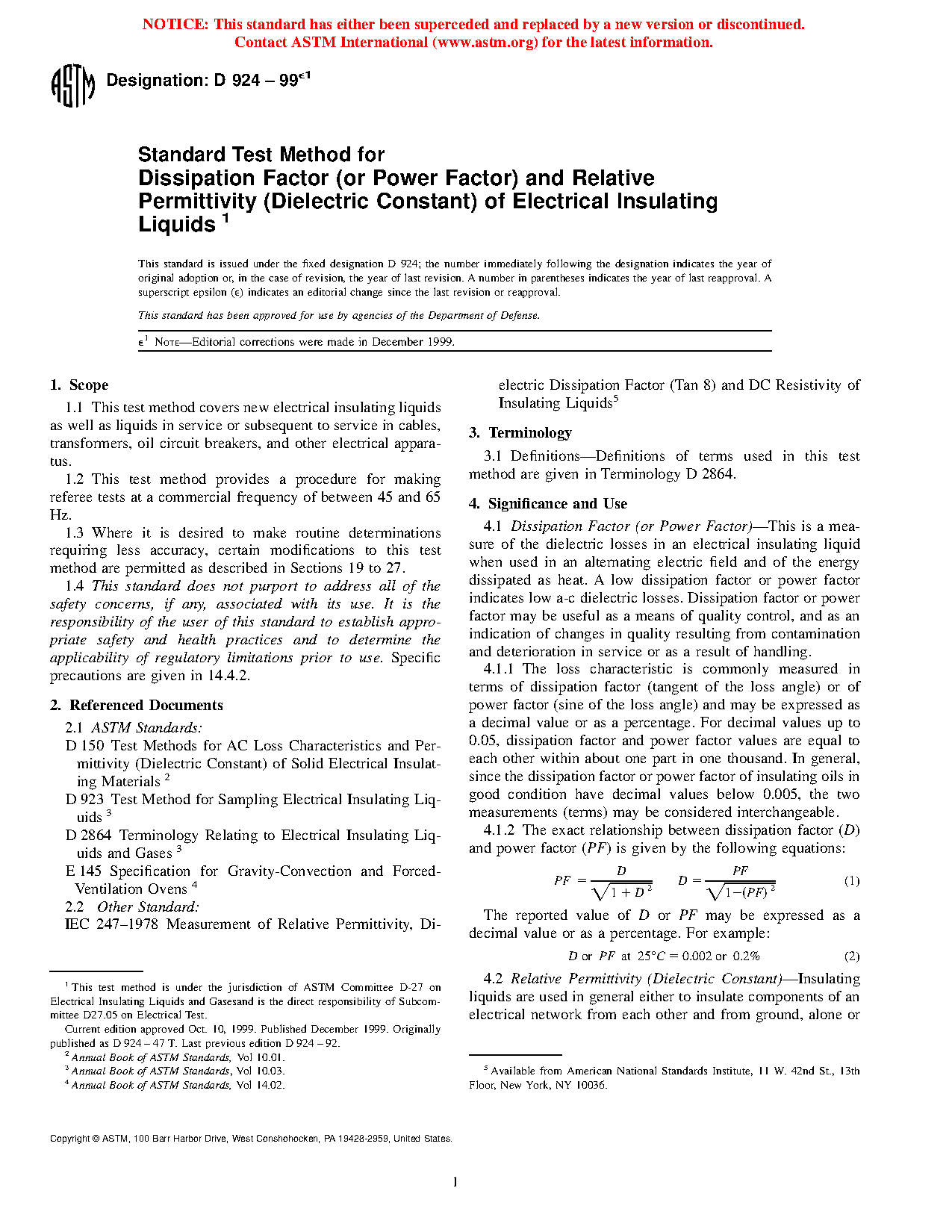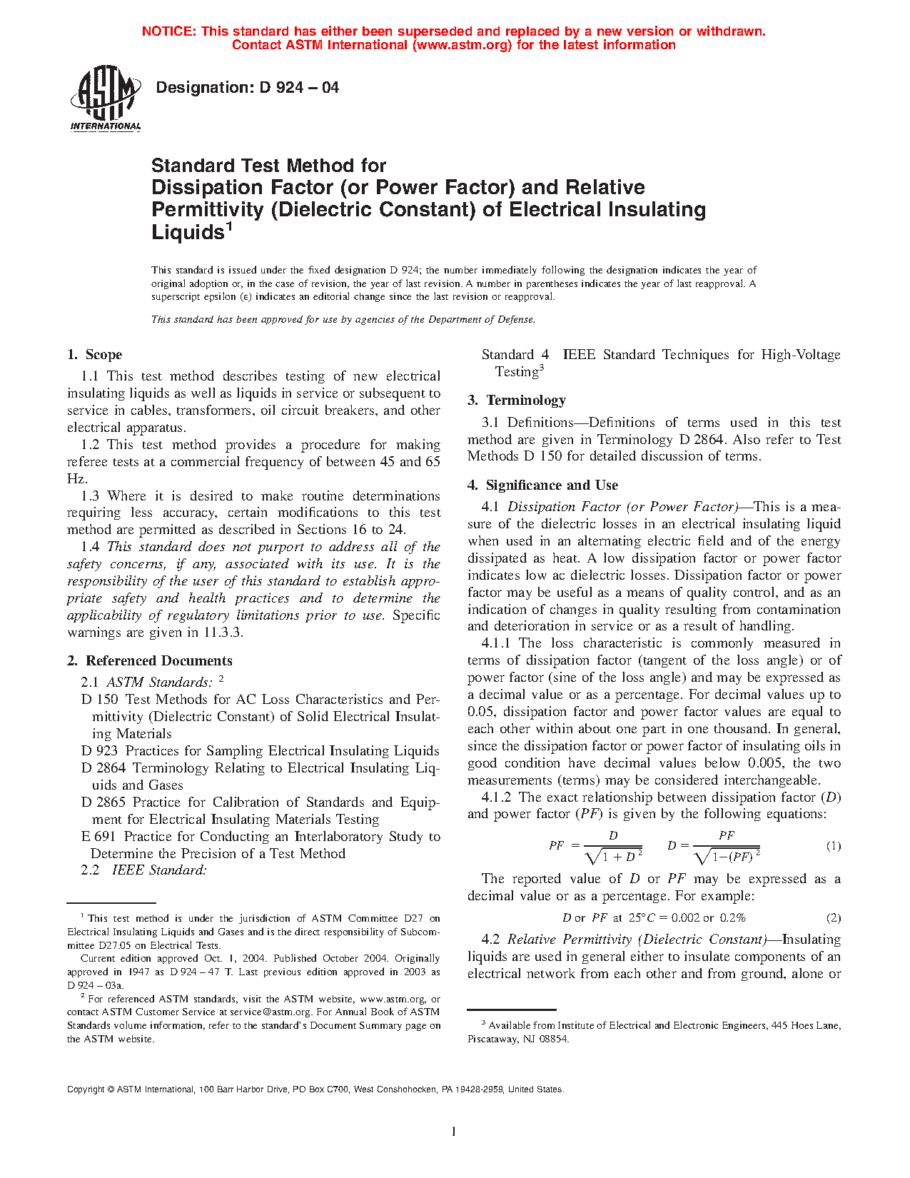Dissipation Factor (or Power Factor)—This is a measure of the dielectric losses in an electrical insulating liquid when used in an alternating electric field and of the energy dissipated as heat. A low dissipation factor or power factor indicates low ac dielectric losses. Dissipation factor or power factor may be useful as a means of quality control, and as an indication of changes in quality resulting from contamination and deterioration in service or as a result of handling.