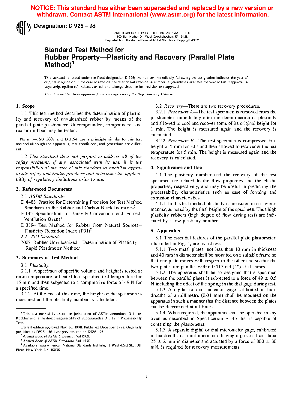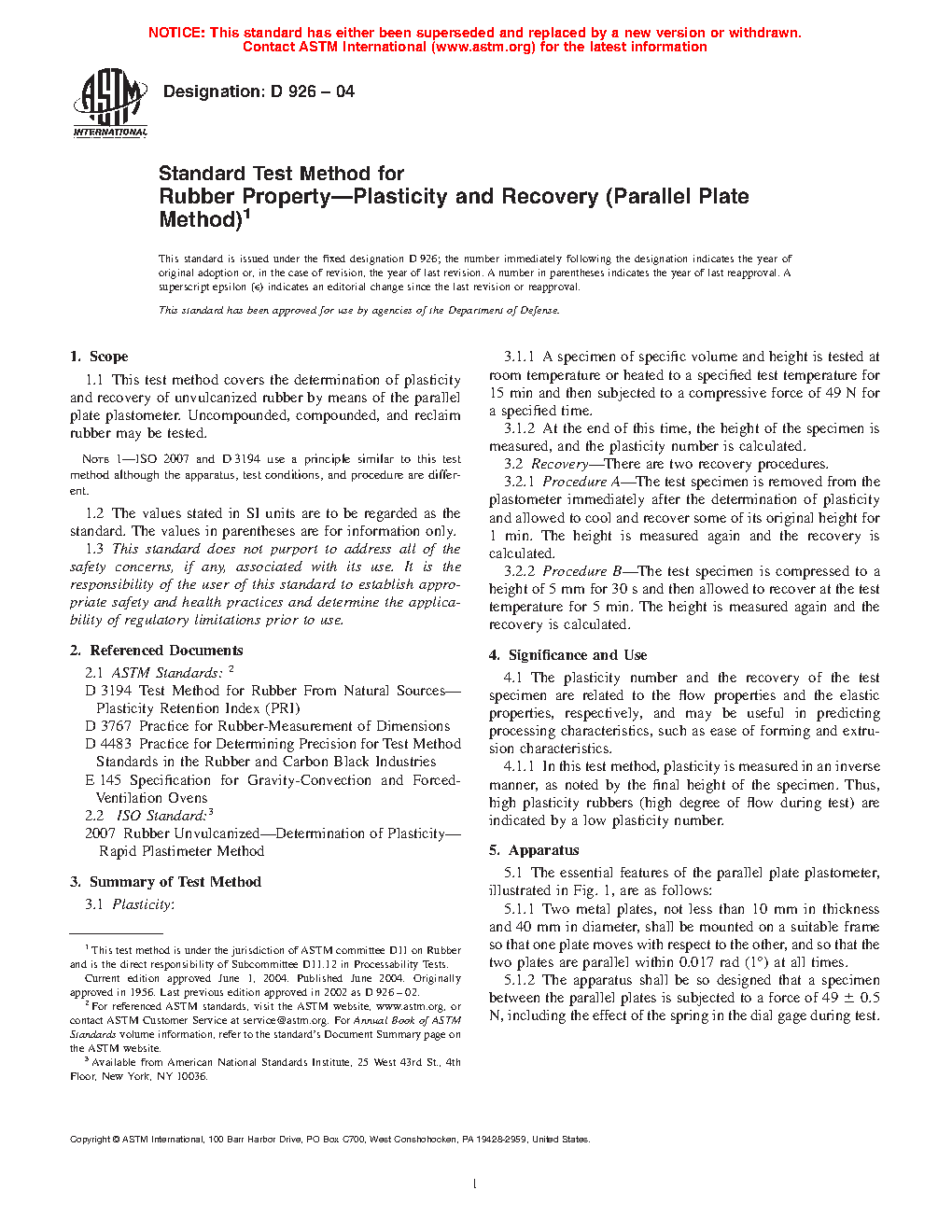 1.1 This test method describes the determination of plasticity and recovery of unvulcanized rubber by means of the parallel plate plastometer. Uncompounded, compounded, and reclaim rubber may be tested.