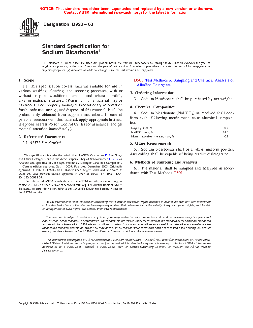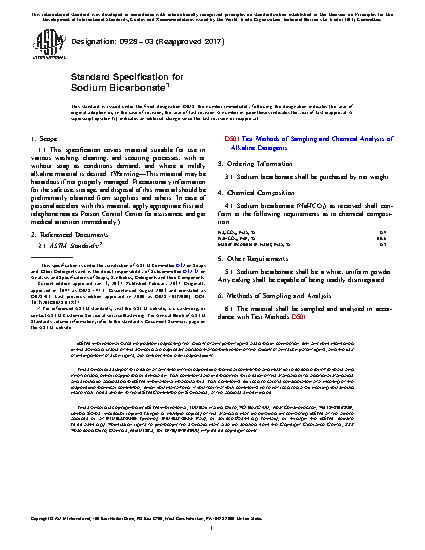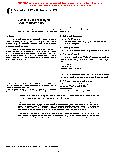 This specification covers sodium bicarbonate for use in various washing, cleaning, and scouring processes. As received sodium bicarbonate shall conform to the chemical requirements according to this specification. Sodium bicarbonate shall be a white, uniform powder, and caking shall be readily disintegrated. Sampling and chemical analysis shall be in accordance with the ASTM standard test methods of alkaline detergents.