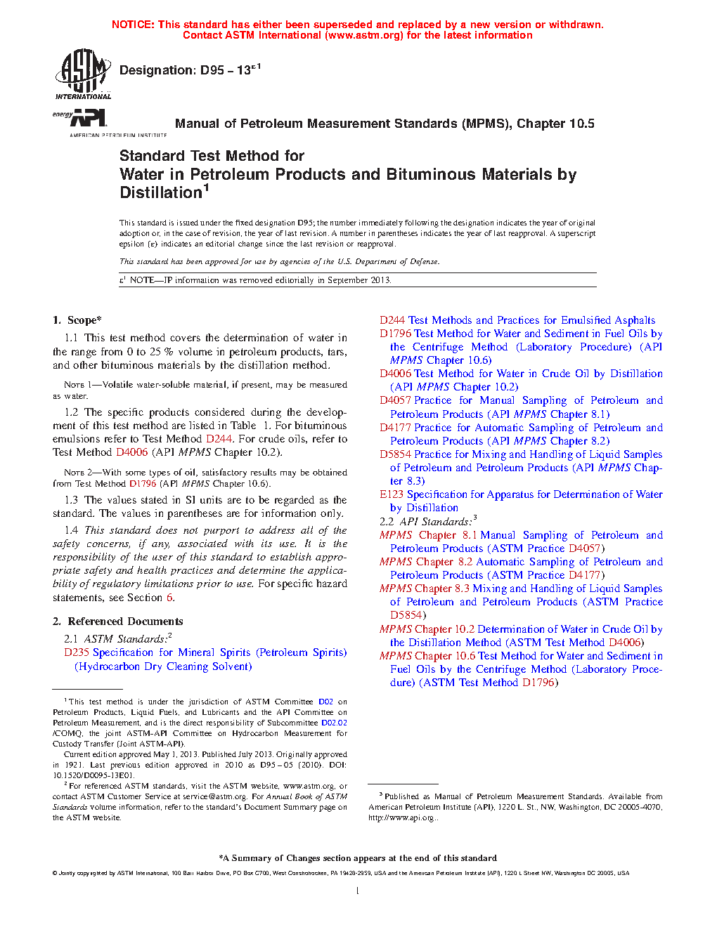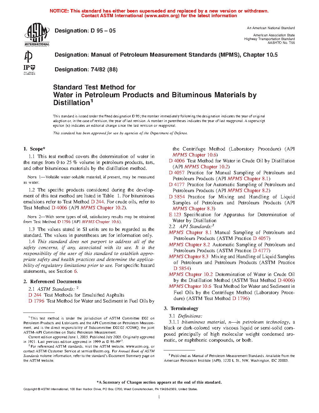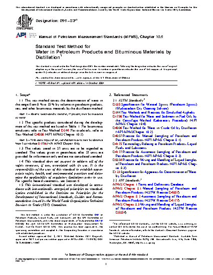 1.1 This test method covers the determination of water in the range from 0 % to 25 % by volume in petroleum products, tars, and other bituminous materials by the distillation method.