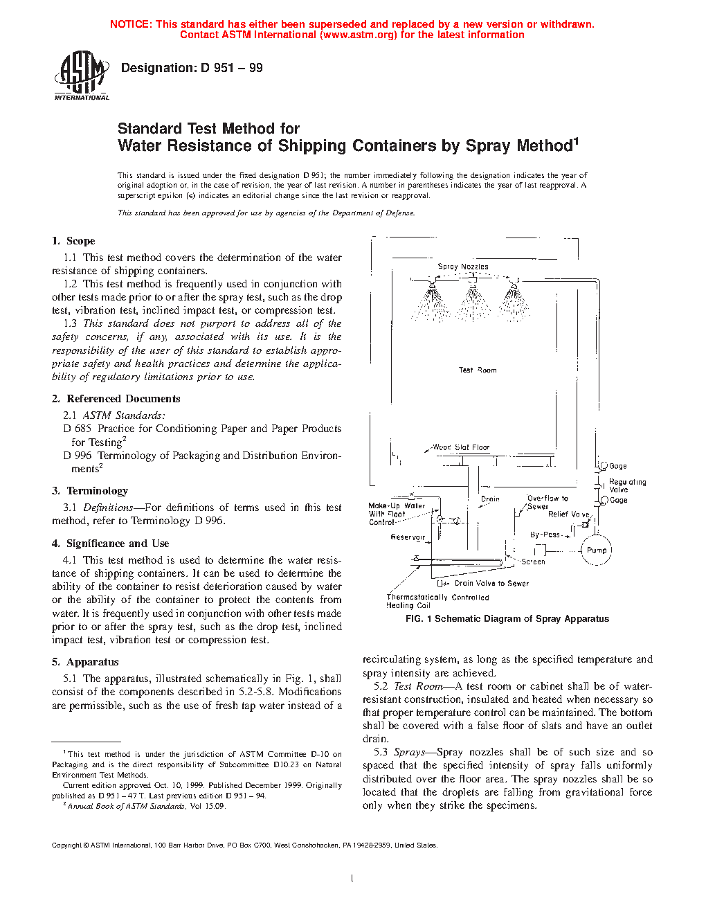 This test method is used to determine the water resistance of shipping containers. It can be used to determine the ability of the container to resist deterioration caused by water or the ability of the container to protect the contents from water. It is frequently used in conjunction with other tests made prior to or after the spray test, such as the drop test, inclined impact test, vibration test or compression test.