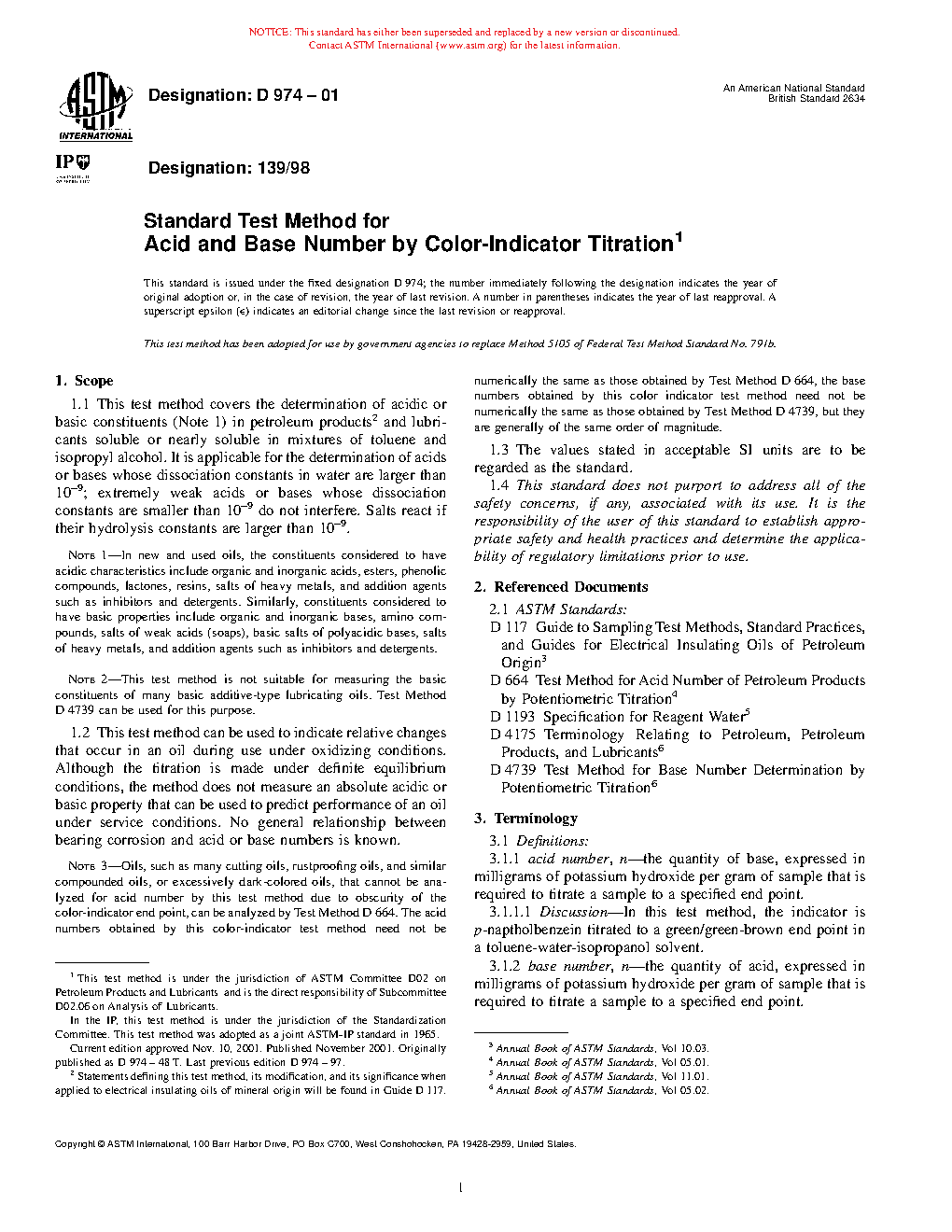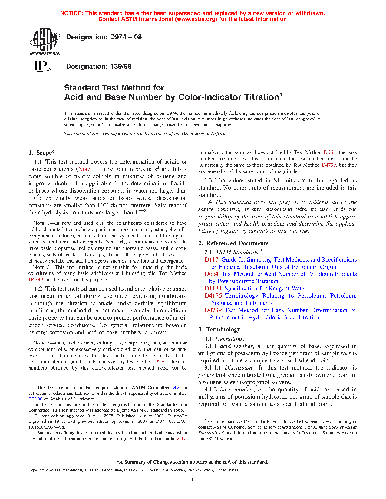 1.2 This test method can be used to indicate relative changes that occur in an oil during use under oxidizing conditions. Although the titration is made under definite equilibrium conditions, the method does not measure an absolute acidic or basic property that can be used to predict performance of an oil under service conditions. No general relationship between bearing corrosion and acid or base numbers is known.