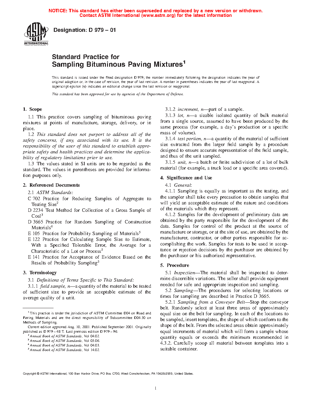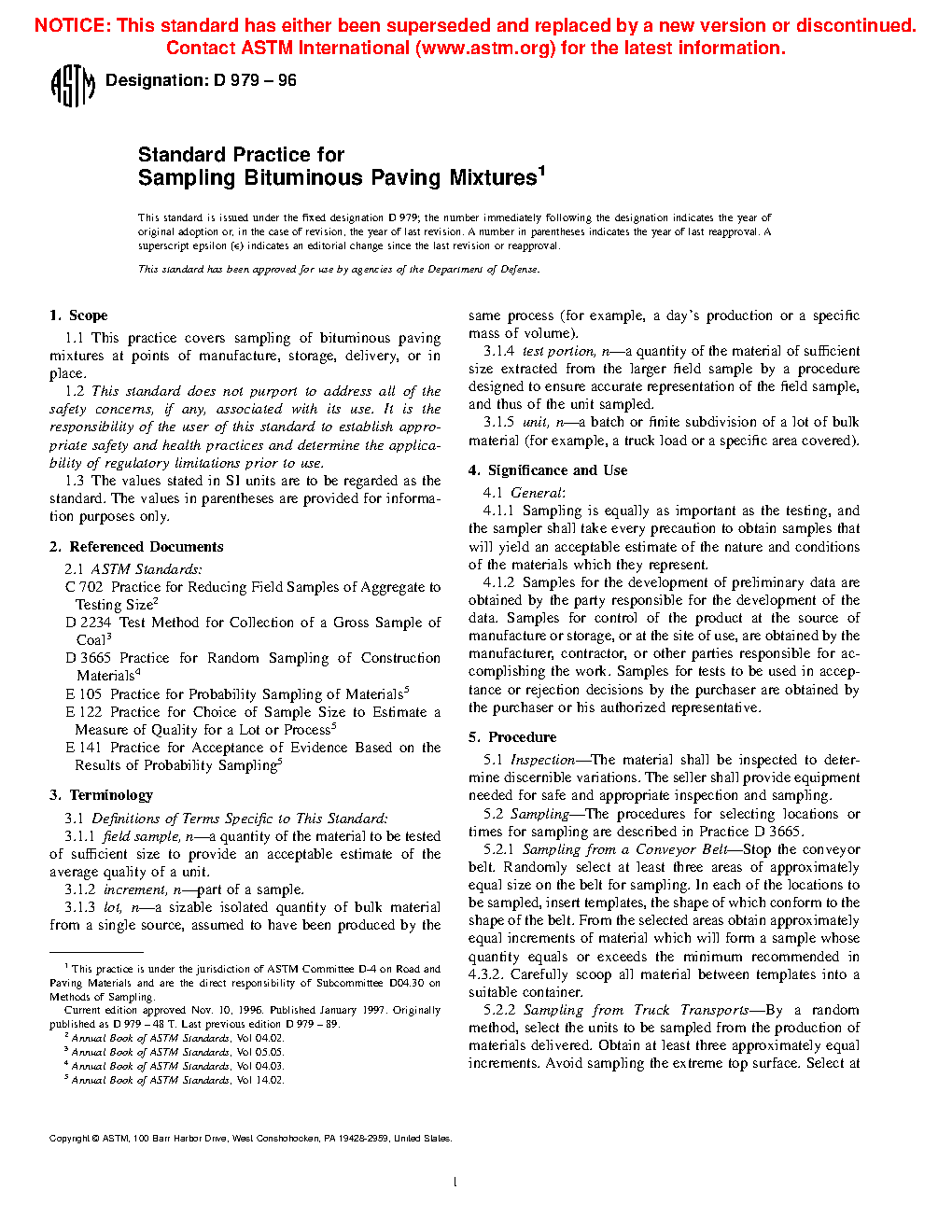 1.1 This practice covers sampling of bituminous paving mixtures at points of manufacture, storage, delivery, or in place.
