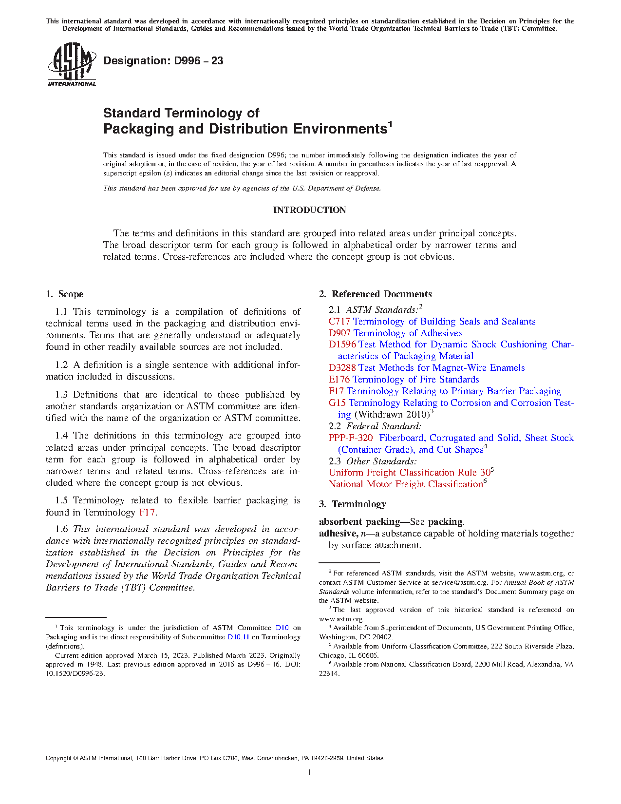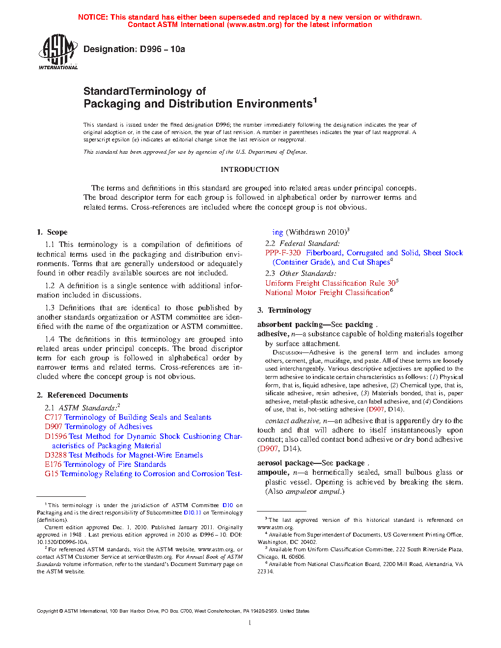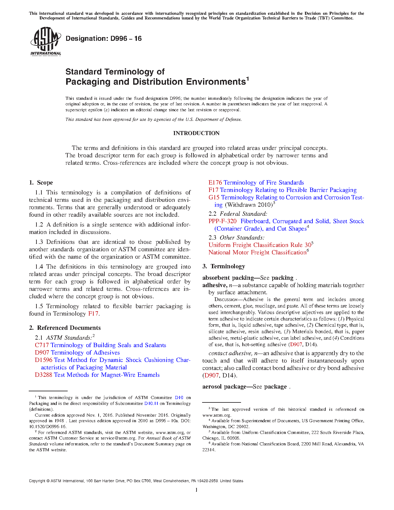 1.1 This terminology is a compilation of definitions of technical terms used in the packaging and distribution environments. Terms that are generally understood or adequately found in other readily available sources are not included.