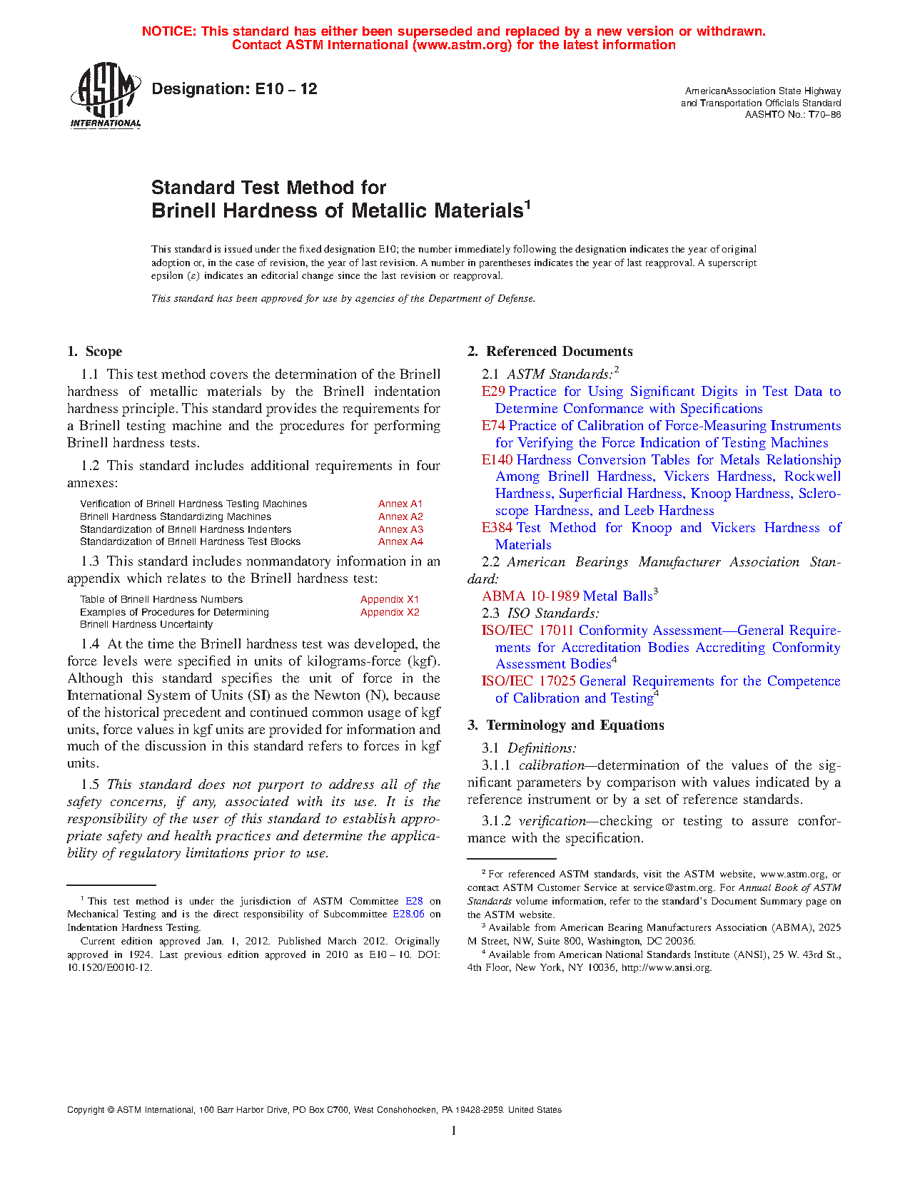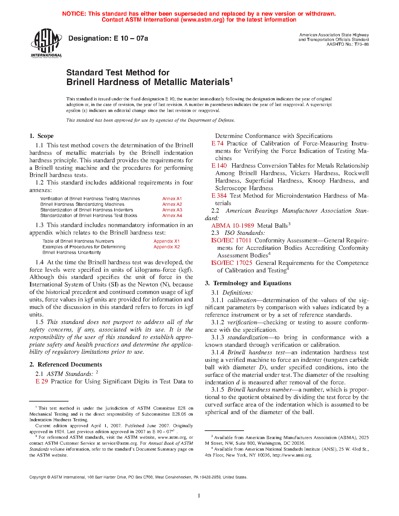 1.2 This test method includes requirements for the use of portable Brinell hardness testing machines that measure Brinell hardness by the Brinell hardness test principle and can meet the requirements of this test method, including the direct and indirect verifications of the testing machine. Portable Brinell hardness testing machines that cannot meet the direct verification requirements and can only be verified by indirect verification requirements are covered in Test Method E110.
