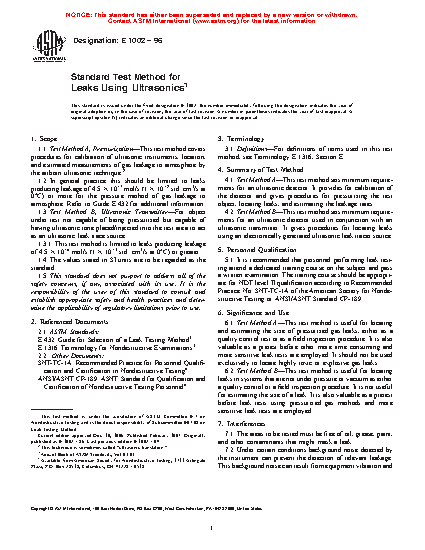 1.1 Practice A, Pressurization—This practice covers procedures for calibration of ultrasonic instruments, location, and estimated measurements of gas leakage to atmosphere by the airborne ultrasonic technique.2