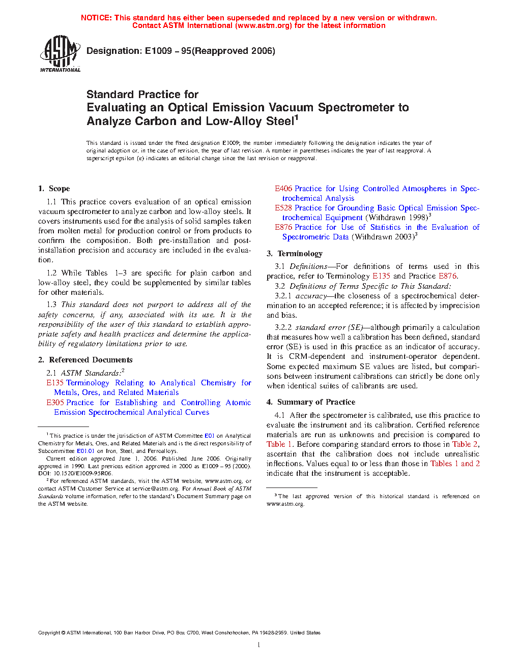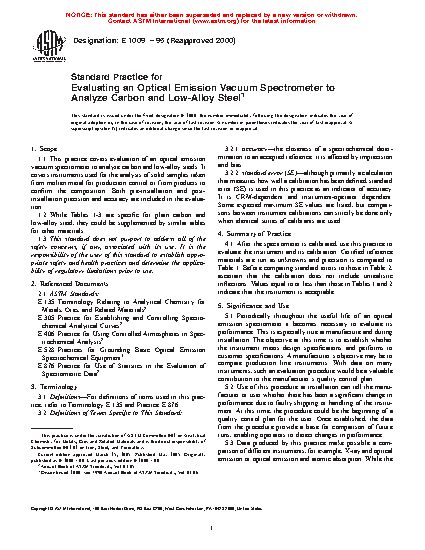 1.1 This practice covers evaluation of an optical emission vacuum spectrometer to analyze carbon and low-alloy steels. It covers instruments used for the analysis of solid samples taken from molten metal for production control or from products to confirm the composition. Both pre-installation and post-installation precision and accuracy are included in the evaluation.