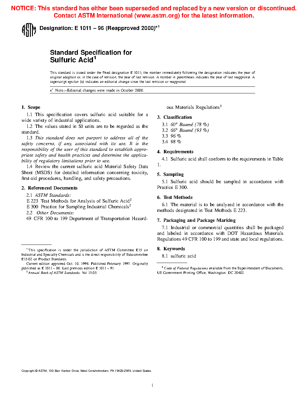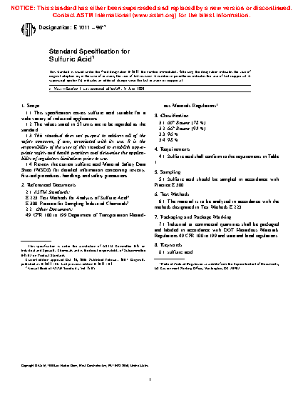 Specification for Sulfuric Acid (Withdrawn 2001)