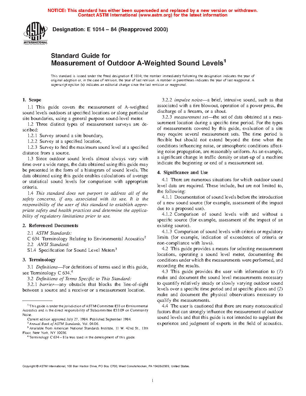 1.3 Since outdoor sound levels almost always vary with time over a wide range, the data obtained using this guide may be presented in the form of a histogram of sound levels. The data obtained using this guide enables calculations of average or statistical sound levels for comparison with appropriate criteria.