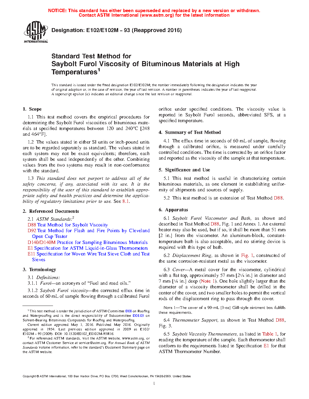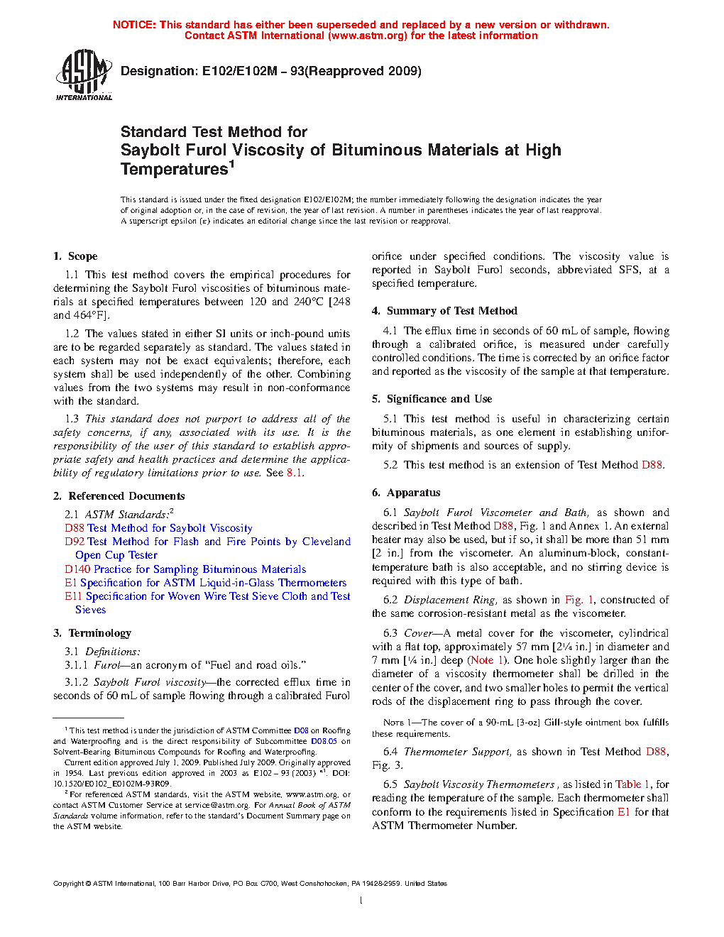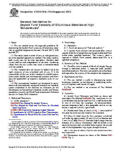 1.1 This test method covers the empirical procedures for determining the Saybolt Furol viscosities of bituminous materials at specified temperatures between 120 and 240°C (248 and 464°F).