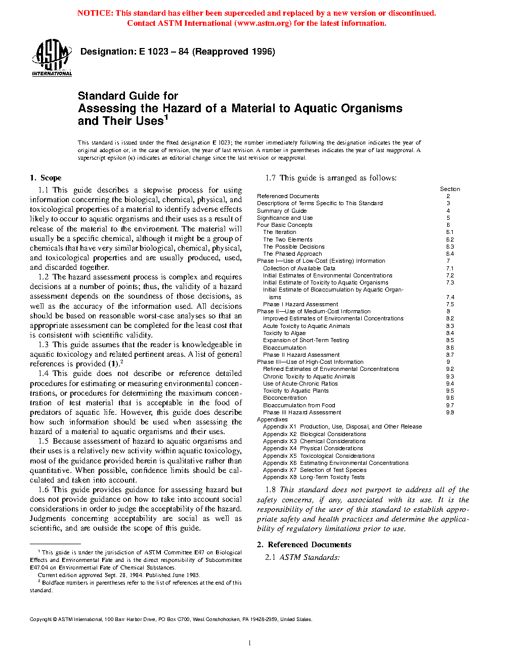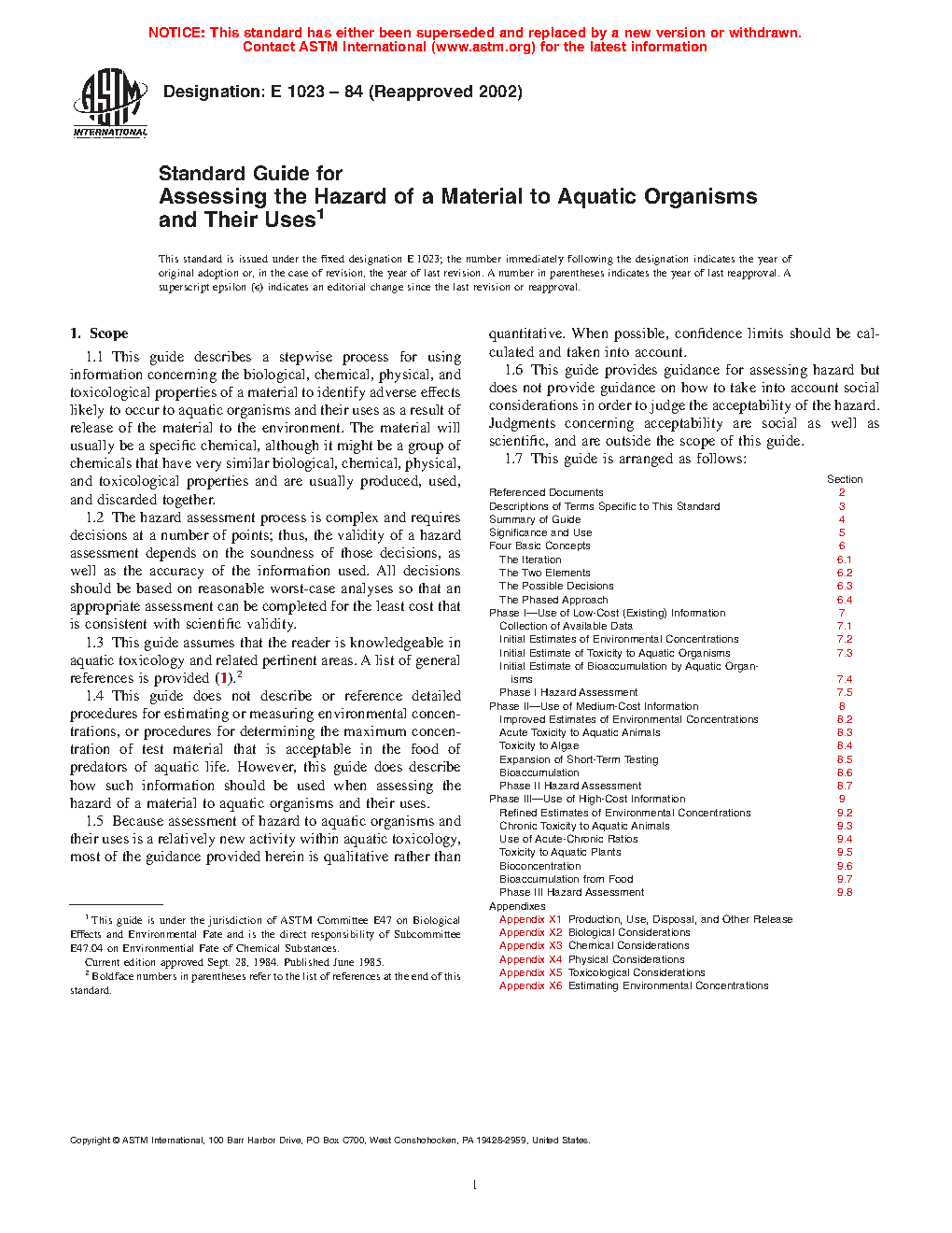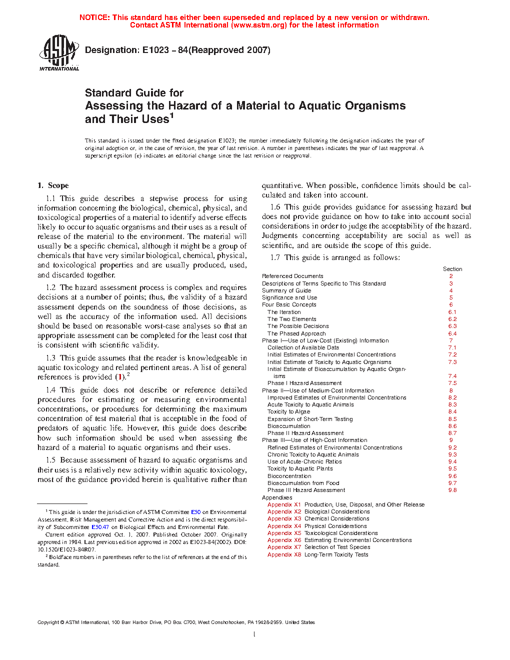 1.4 This guide does not describe or reference detailed procedures for estimating or measuring environmental concentrations, or procedures for determining the maximum concentration of test material that is acceptable in the food of predators of aquatic life. However, this guide does describe how such information should be used when assessing the hazard of a material to aquatic organisms and their uses.