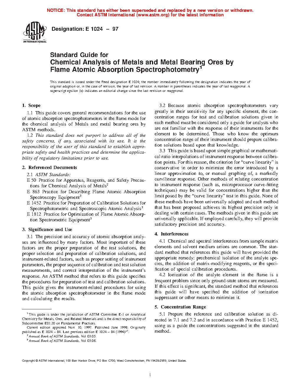 Standard Guide for Chemical Analysis of Metals and Metal Bearing Ores by Flame Atomic Absorption Spectrophotometry (Withdrawn 2004)