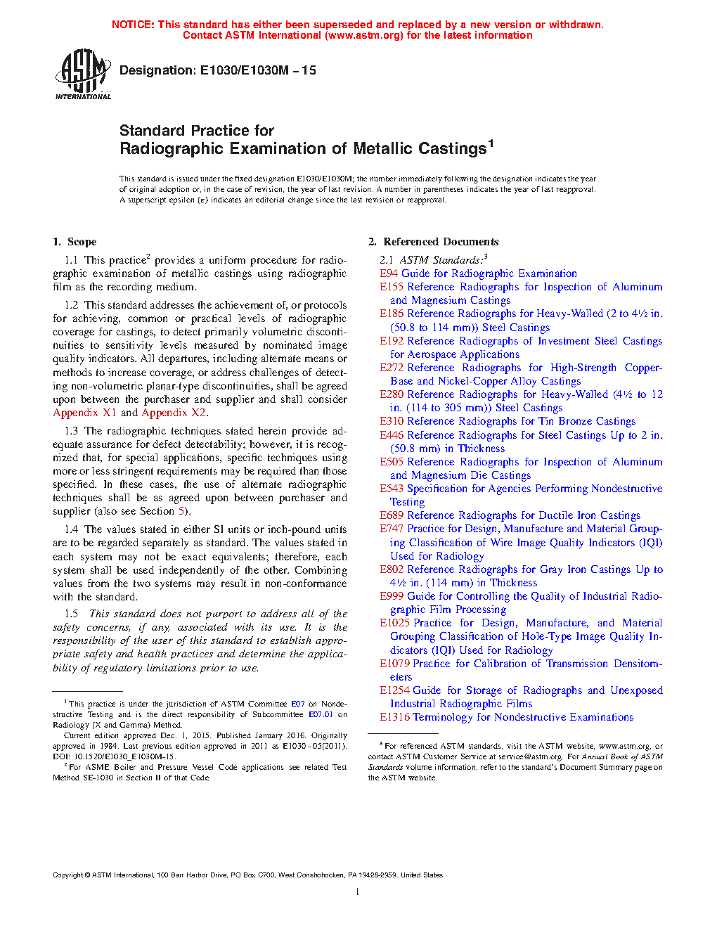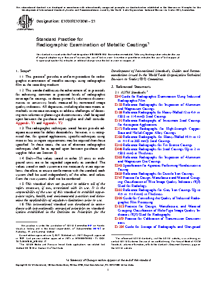1.2 This standard addresses the achievement of, or protocols for achieving, common or practical levels of radiographic coverage for castings, to detect primarily volumetric discontinuities to sensitivity levels measured by nominated image quality indicators. All departures, including alternate means or methods to increase coverage, or address challenges of detecting non-volumetric planar-type discontinuities, shall be agreed upon between the purchaser and supplier and shall consider Appendix X1 and Appendix X2.