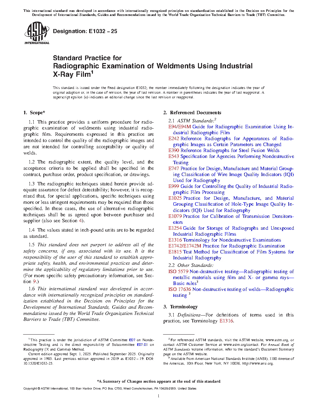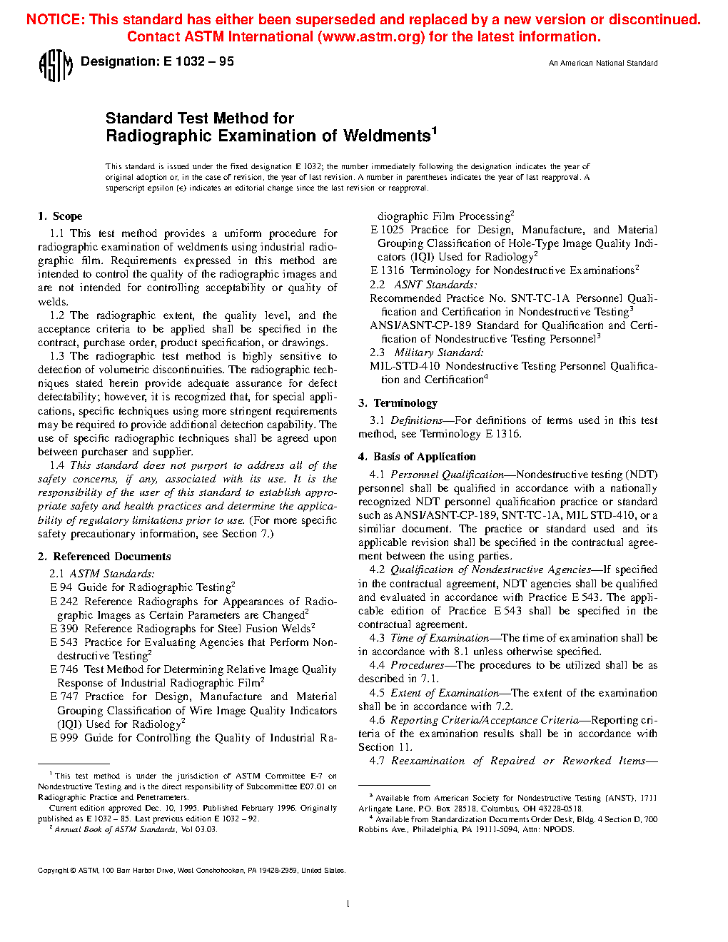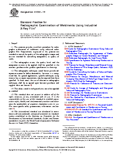 1.1 This practice provides a uniform procedure for radiographic examination of weldments using industrial radiographic film. Requirements expressed in this practice are intended to control the quality of the radiographic images and are not intended for controlling acceptability or quality of welds.