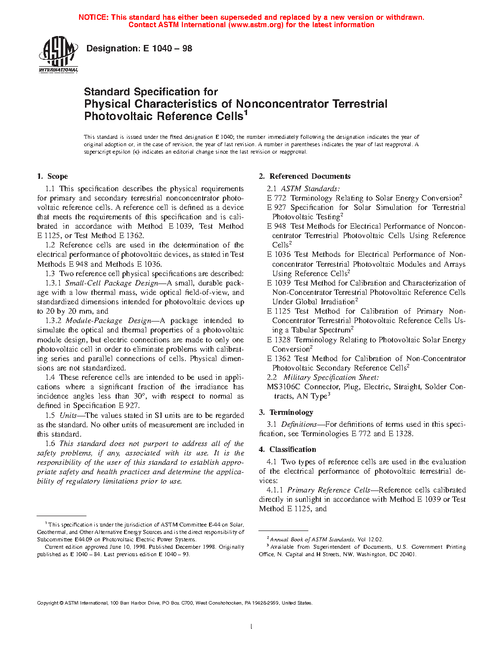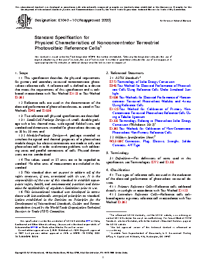 1.1 This specification describes the physical requirements for primary and secondary terrestrial nonconcentrator photovoltaic reference cells. A reference cell is defined as a device that meets the requirements of this specification and is calibrated in accordance with Test Method E1125 or Test Method E1362.