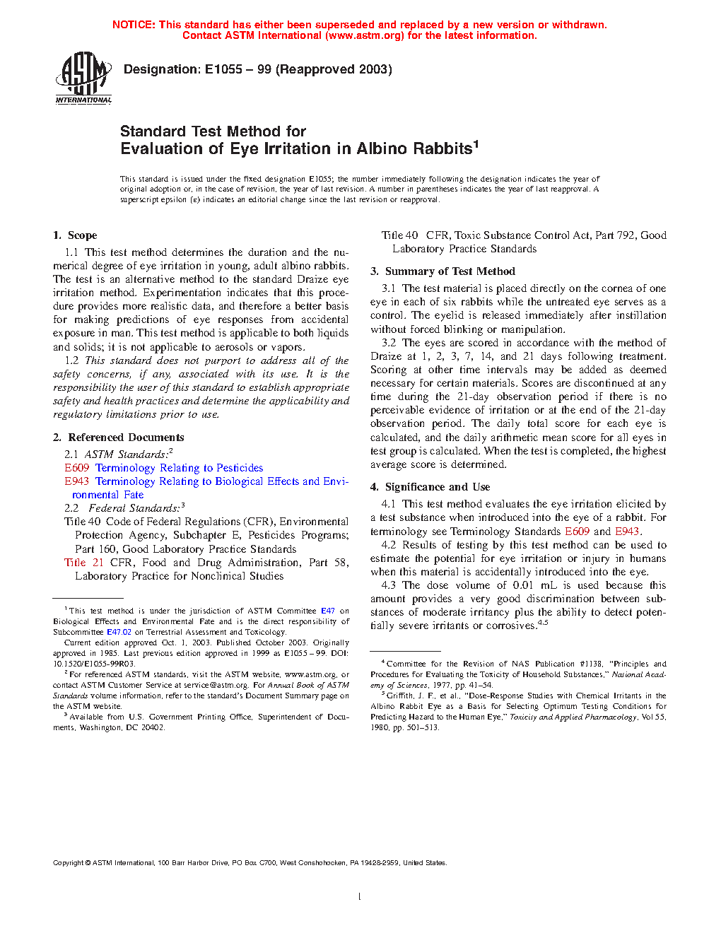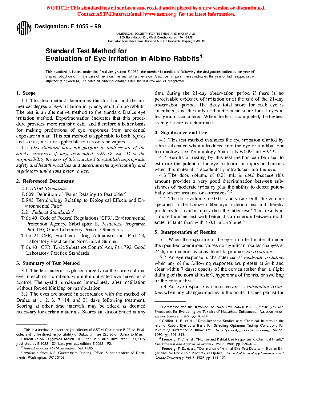 1.1 This test method determines the duration and the numerical degree of eye irritation in young, adult albino rabbits. The test is an alternative method to the standard Draize eye irritation method. Experimentation indicates that this procedure provides more realistic data, and therefore a better basis for making predictions of eye responses from accidental exposure in man. This test method is applicable to both liquids and solids; it is not applicable to aerosols or vapors.