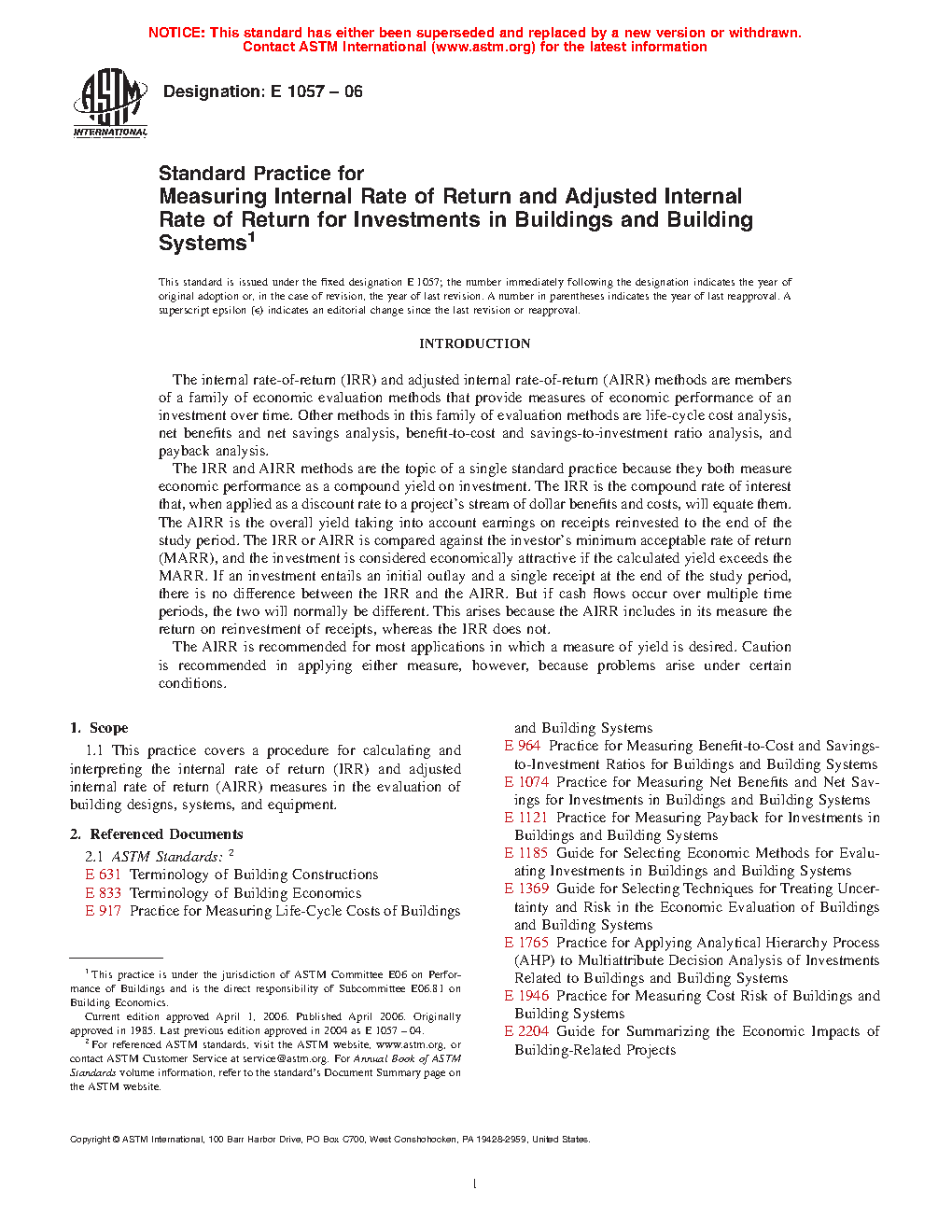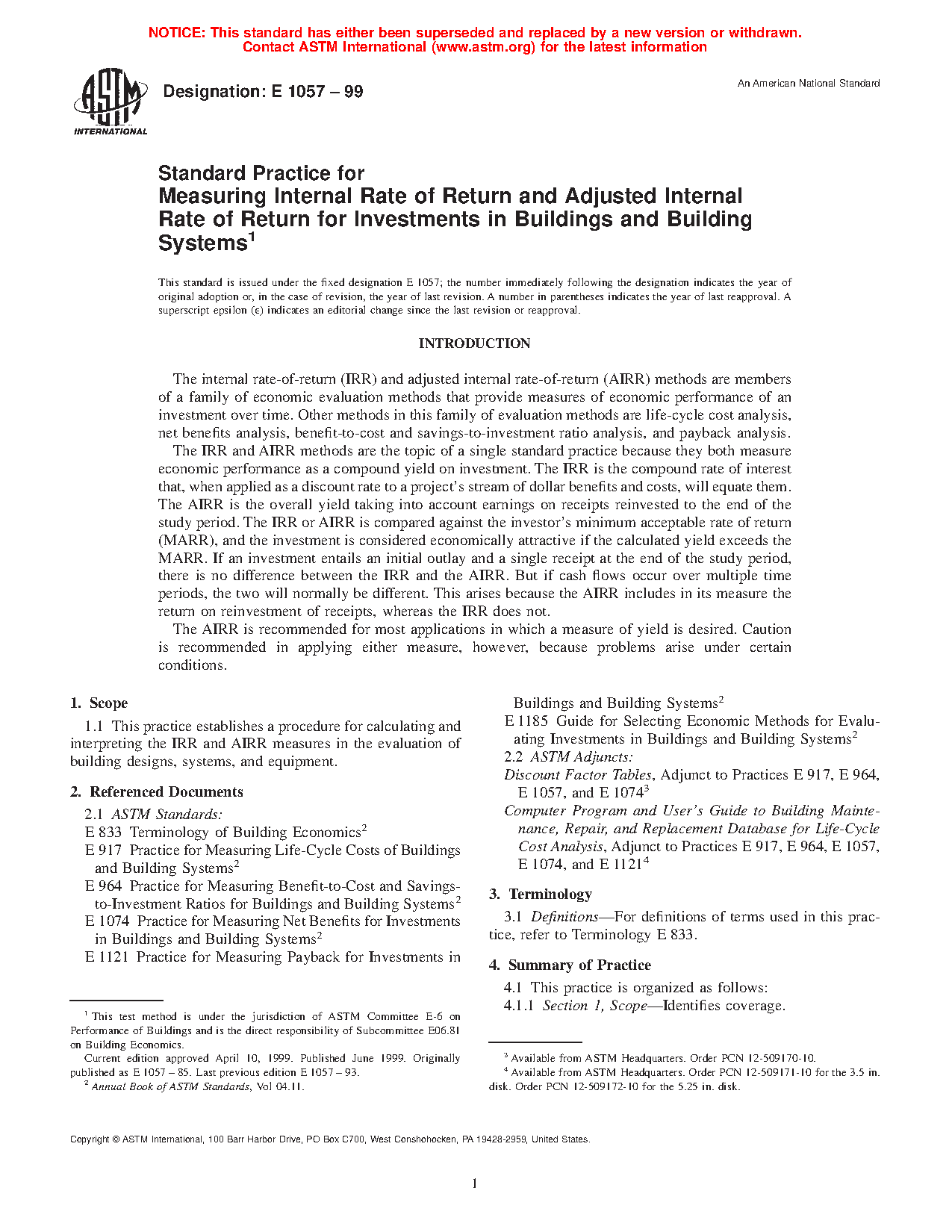 1.1 This practice covers a procedure for calculating and interpreting the internal rate of return (IRR) and adjusted internal rate of return (AIRR) measures in the evaluation of building designs, systems, and equipment.