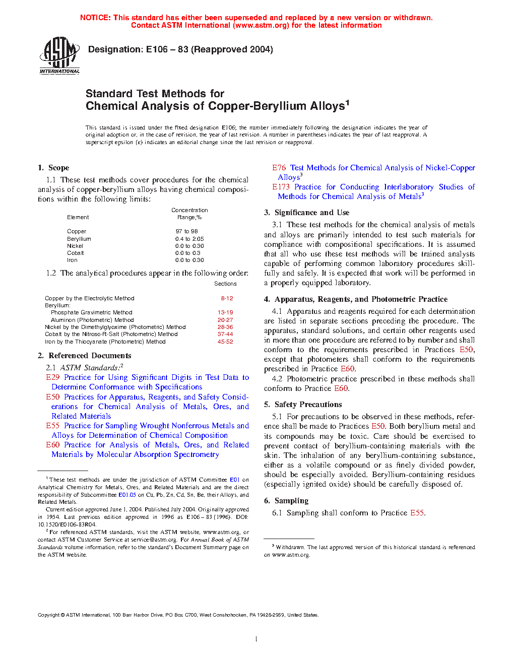 Standard Test Methods for Chemical Analysis of Copper-Beryllium Alloys (Withdrawn 2011)