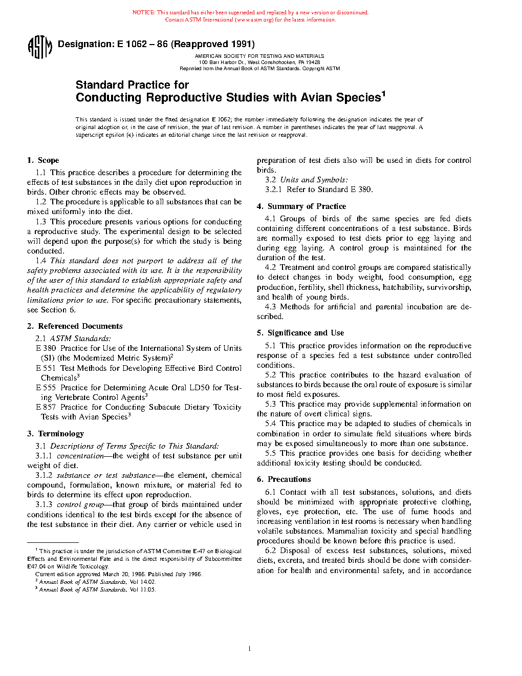 1.1 This practice describes a procedure for determining the effects of test substances in the daily diet upon reproduction in birds. Other chronic effects may be observed.