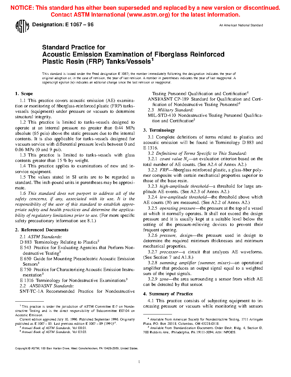 1.1 This practice covers acoustic emission (AE) examination or monitoring of fiberglass-reinforced plastic (FRP) tanks-vessels (equipment) under pressure or vacuum to determine structural integrity.