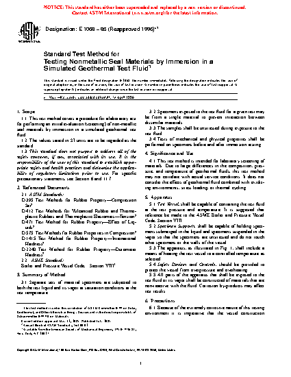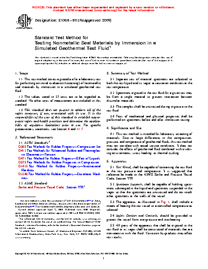 1.1 This test method covers a procedure for a laboratory test for performing an initial evaluation (screening) of nonmetallic seal materials by immersion in a simulated geothermal test fluid.