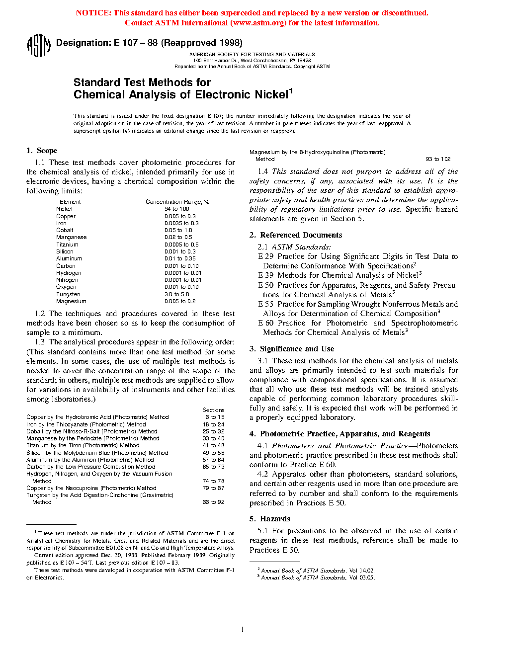 Sections Copper by the Hydrobromic Acid (Photometric) Method 8 to 15 Iron by the Thiocyanate (Photometric) Method 16 to 24 Cobalt by the Nitroso-R-Salt (Photometric) Method 25 to 32 Manganese by the Periodate (Photometric) Method 33 to 40 Titanium by the Tiron (Photometric) Method 41 to 48 Silicon by the Molybdenum Blue (Photometric) Method 49 to 56 Aluminum by the Aluminon (Photometric) Method 57 to 64 Carbon by the Low-Pressure Combustion Method 65 to 73 Hydrogen, Nitrogen, and Oxygen by the Vacuum Fusion Method 74 to 78 Copper by the Neocuproine (Photometric) Method 79 to 87 Tungsten by the Acid Digestion-Cinchonine (Gravimetric) Method 88 to 92 Magnesium by the 8-Hydroxyquinoline (Photometric) Method 93 to 1021.4 This standard does not purport to address all of the safety problems, if any, associated with its use. It is the responsibility of the user of this standard to establish appropriate safety and health practices and determine the applicability of regulatory limitations prior to use. Specific hazard statements are given in Section 5.