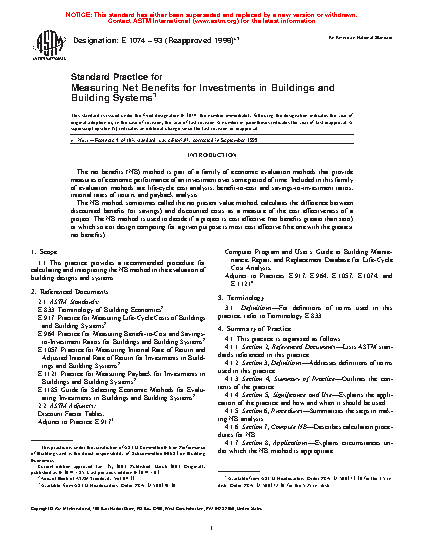 1.1 This practice covers a recommended procedure for calculating and interpreting the net benefits (NB) and net savings (NS) methods in the evaluation of building designs and systems.