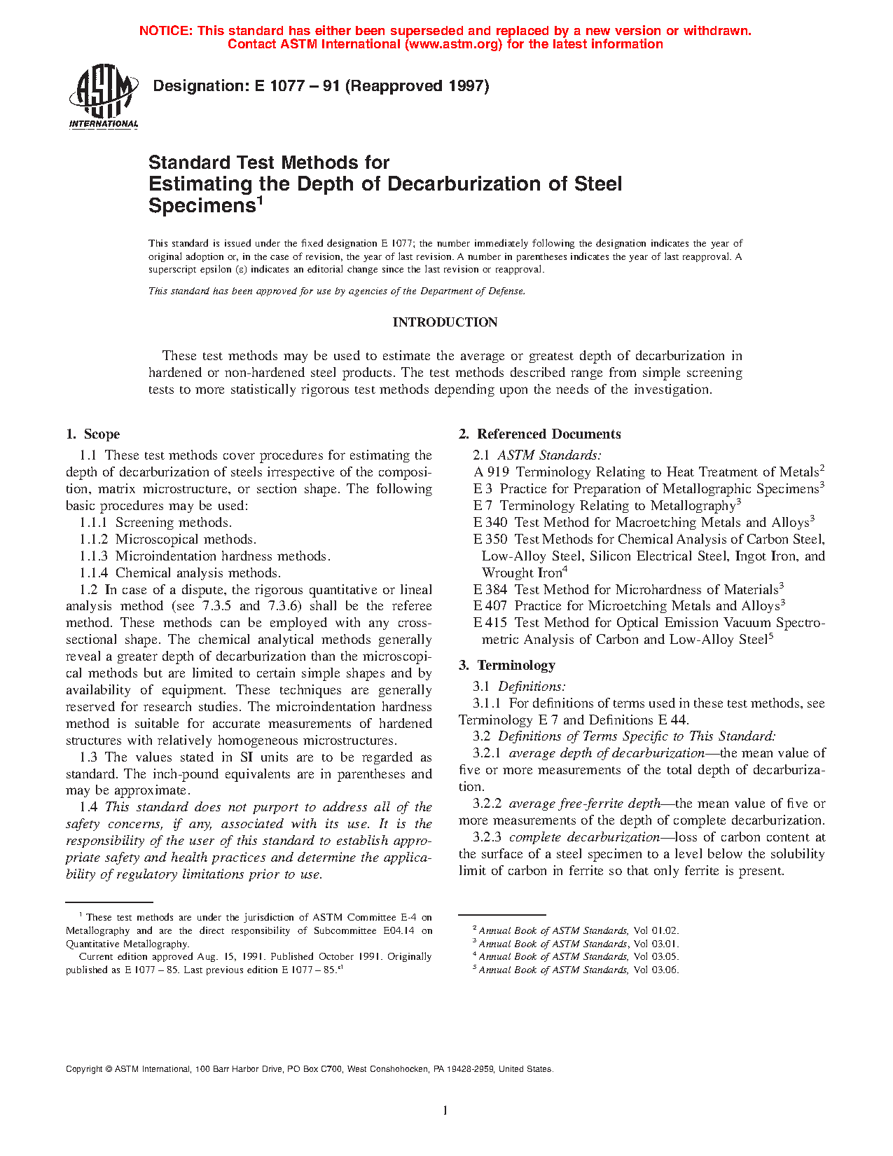 1.1 These test methods cover procedures for estimating the depth of decarburization of steels irrespective of the composition, matrix microstructure, or section shape. The following basic procedures may be used: