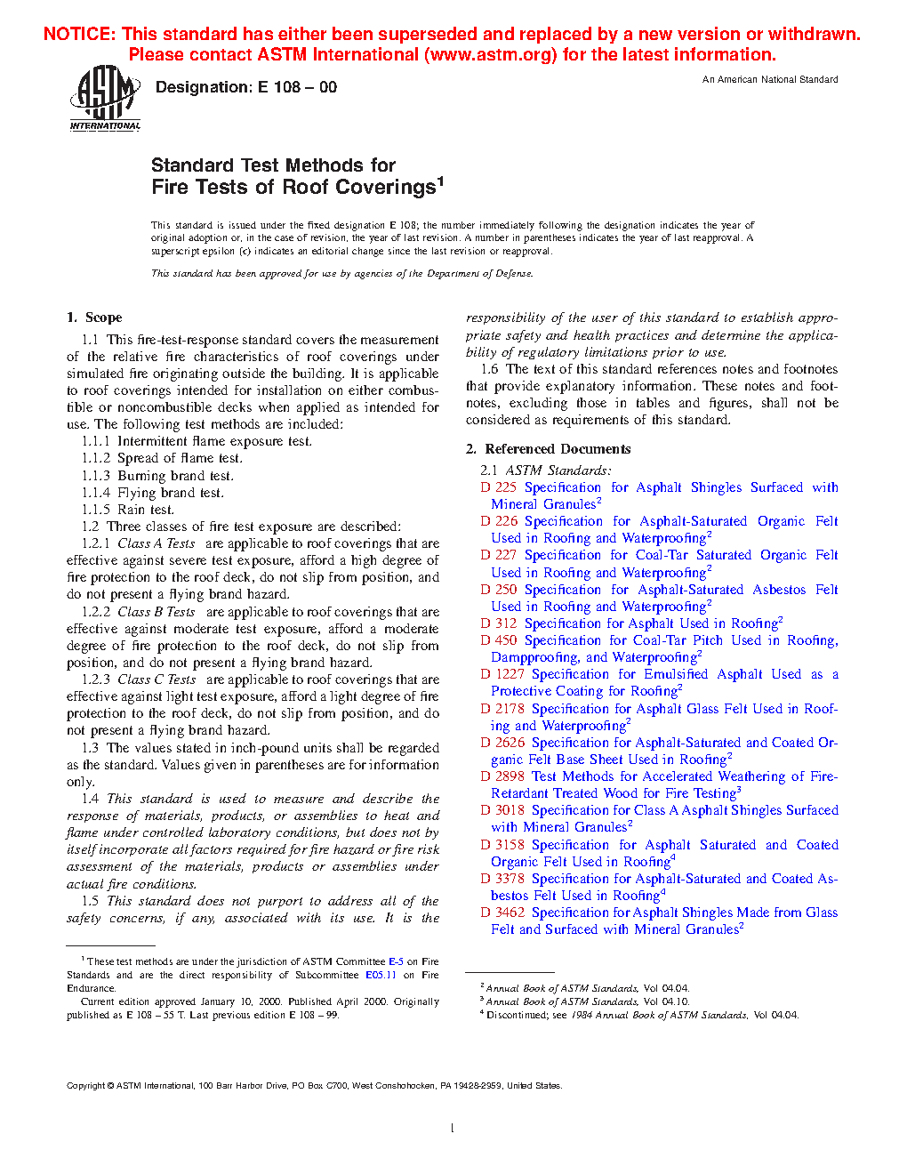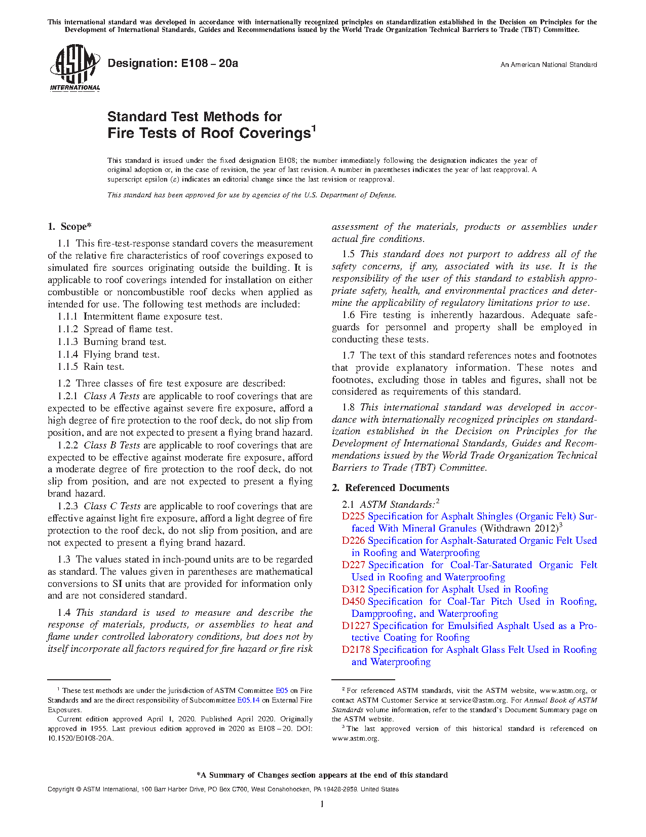 The test methods described herein are intended to provide a basis for relative comparison of roof coverings. The test methods include simulated fire exposure to the outside of the roof coverings, and, where applicable, a determination as to whether the fire performance characteristics of the roof coverings will be adversely affected by prolonged exposure to rain.
