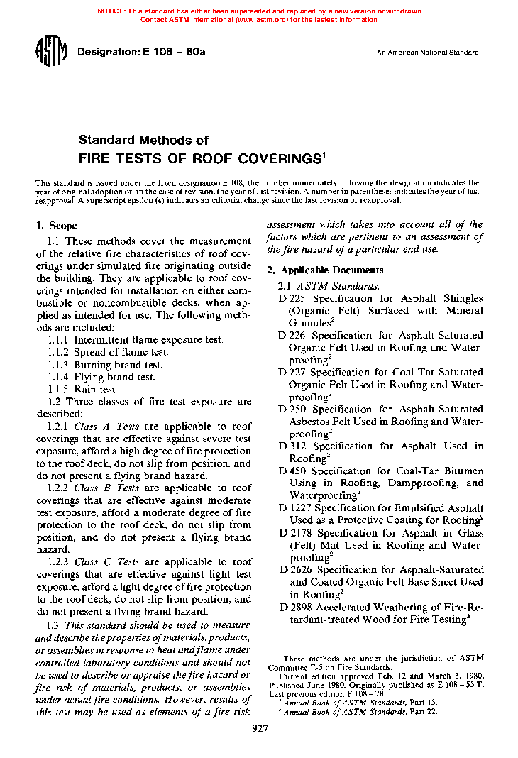 1.1 This fire-test-response standard covers the measurement of the relative fire characteristics of roof coverings exposed to simulated fire sources originating outside the building. It is applicable to roof coverings intended for installation on either combustible or noncombustible roof decks when applied as intended for use. The following test methods are included: