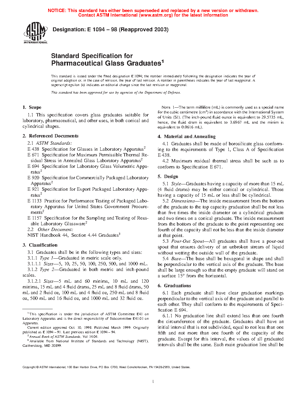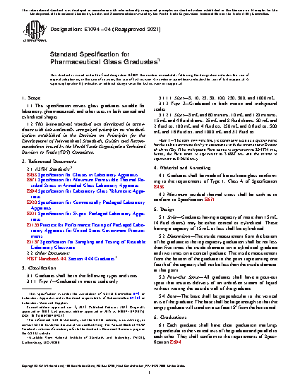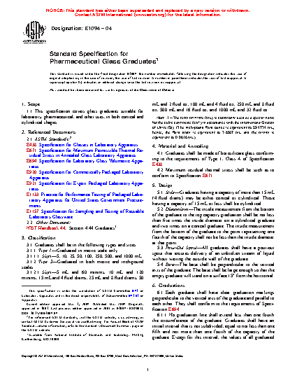 This specification covers glass graduates suitable for laboratory, pharmaceutical, and other uses, in both conical and cylindrical shapes. Graduates shall be in the following types: type 1 - graduated in metric scale only, and type 2 - graduated in both metric and inch-pound scales. Graduates having a capacity of more than 15 mL (4 fluid drams) may be either conical or cylindrical. Those having a capacity of 15 mL or less shall be cylindrical. Each graduate shall have clear graduation markings perpendicular to the vertical axis of the graduate and parallel to each other. Capacities, graduation ranges, values of graduated intervals, and numbered graduations applicable to single-scale graduates and to appropriate portions of double-scale graduates are presented in details.