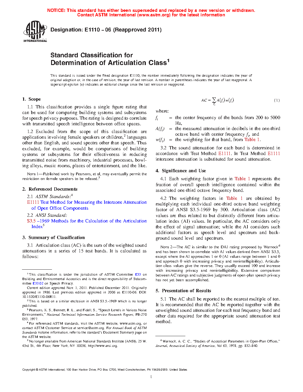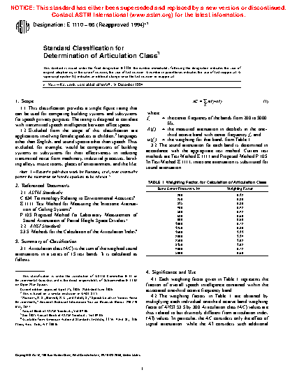 4.2 The weighting factors in Table 1 are obtained by multiplying each individual one-third octave band weighting factor of ANSI S3.5-1969 by 300. Articulation class (AC) values are thus related to but distinctly different from articulation index (AI) values. In particular, the AC considers only the effect of signal attenuation; while the AI considers such additional factors as speech level and spectrum and background sound level and spectrum.