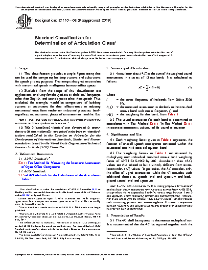 Note 2: The AC is similar to the DAI rating proposed by Warnock6 and has been shown to correlate with AI values derived from ANSI S3.5, except where the AI approaches 1 or 0 (AI values range between 1 and 0 and approach 0 with increasing privacy and nonintelligibility). Articulation class values give the reverse. They usually exceed 100 and increase with increasing privacy and nonintelligibility. Extensive comparison between AC ratings and subjective judgments of open-plan speech privacy has not yet been accomplished.