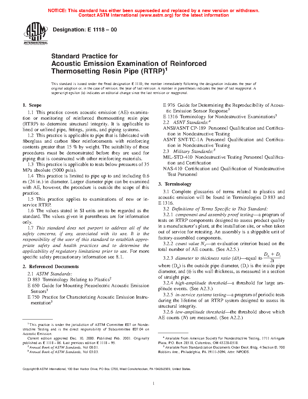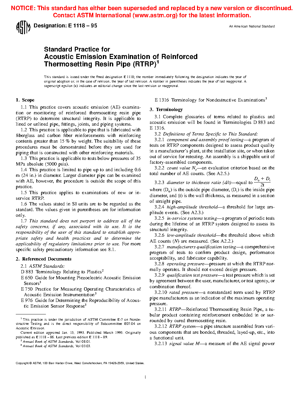 1.1 This practice covers acoustic emission (AE) examination or monitoring of reinforced thermosetting resin pipe (RTRP) to determine structural integrity. It is applicable to lined or unlined pipe, fittings, joints, and piping systems.