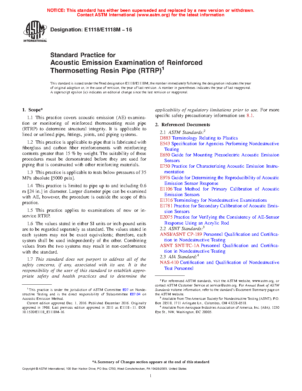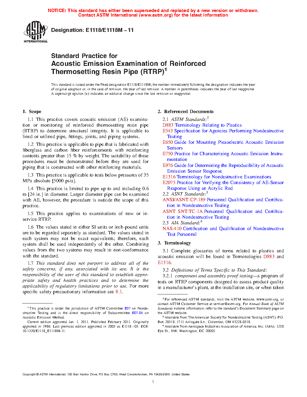 1.1 This practice covers acoustic emission (AE) examination or monitoring of reinforced thermosetting resin pipe (RTRP) to determine structural integrity. It is applicable to lined or unlined pipe, fittings, joints, and piping systems.