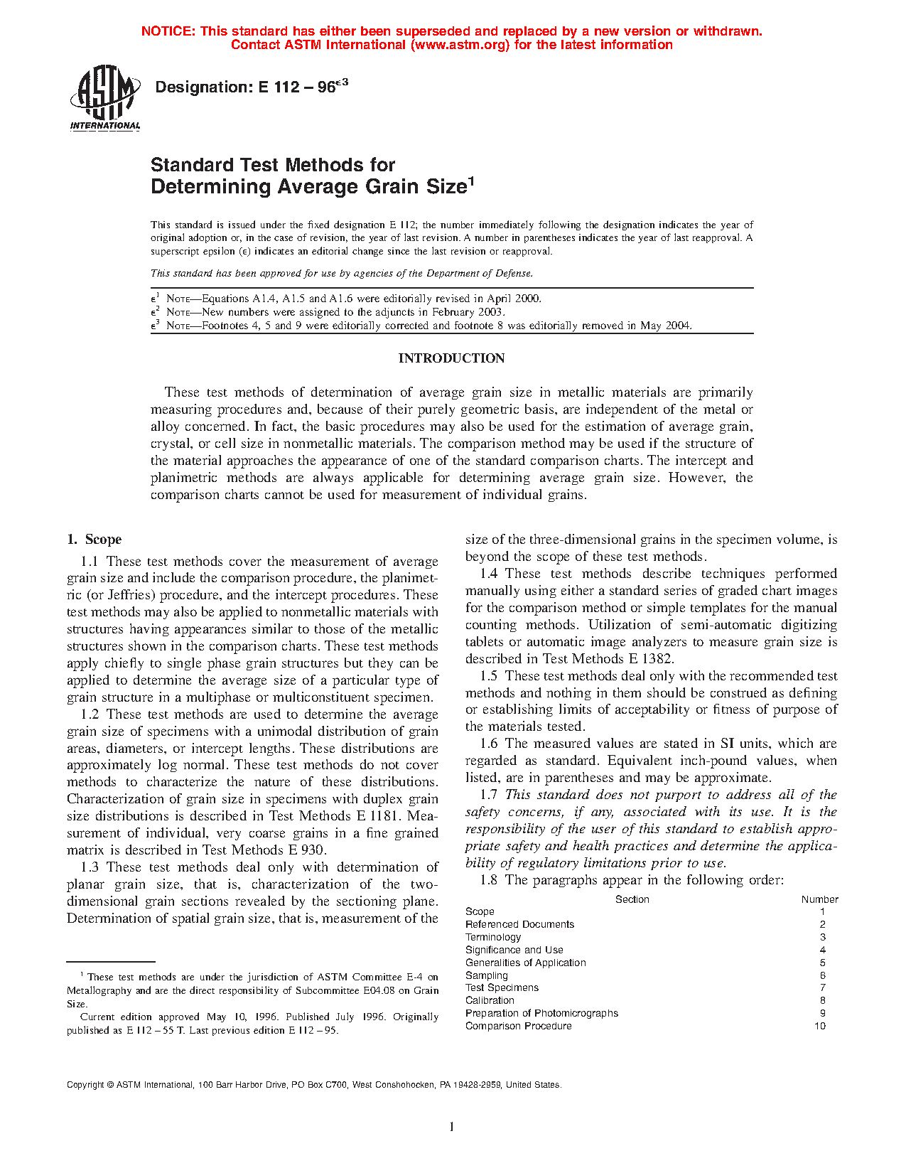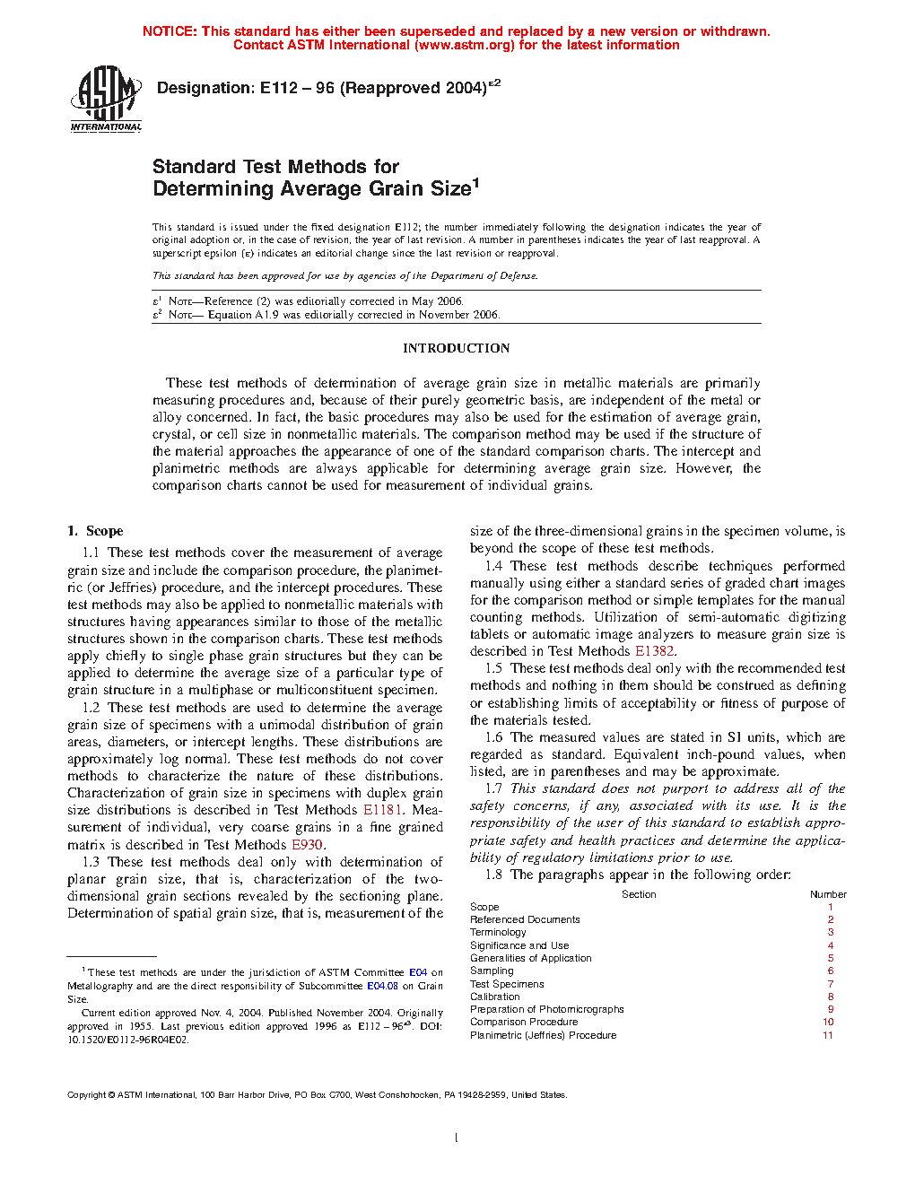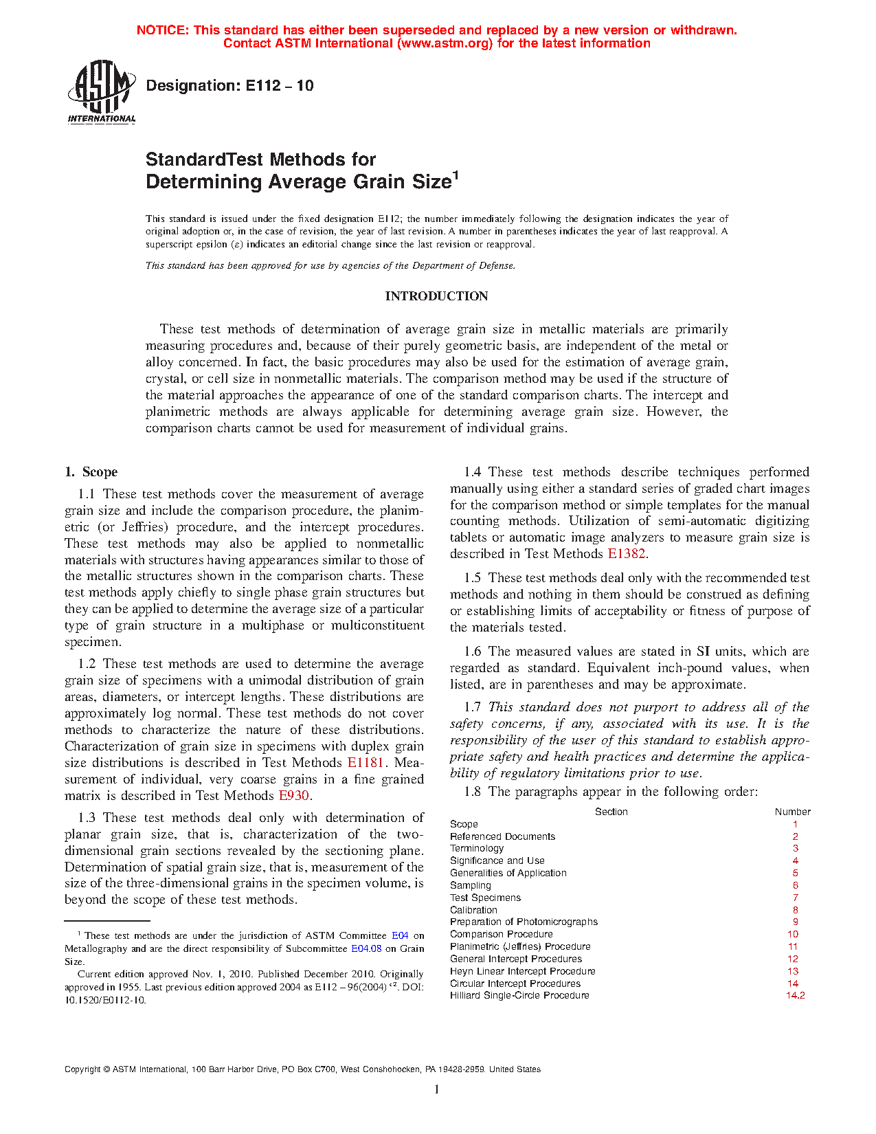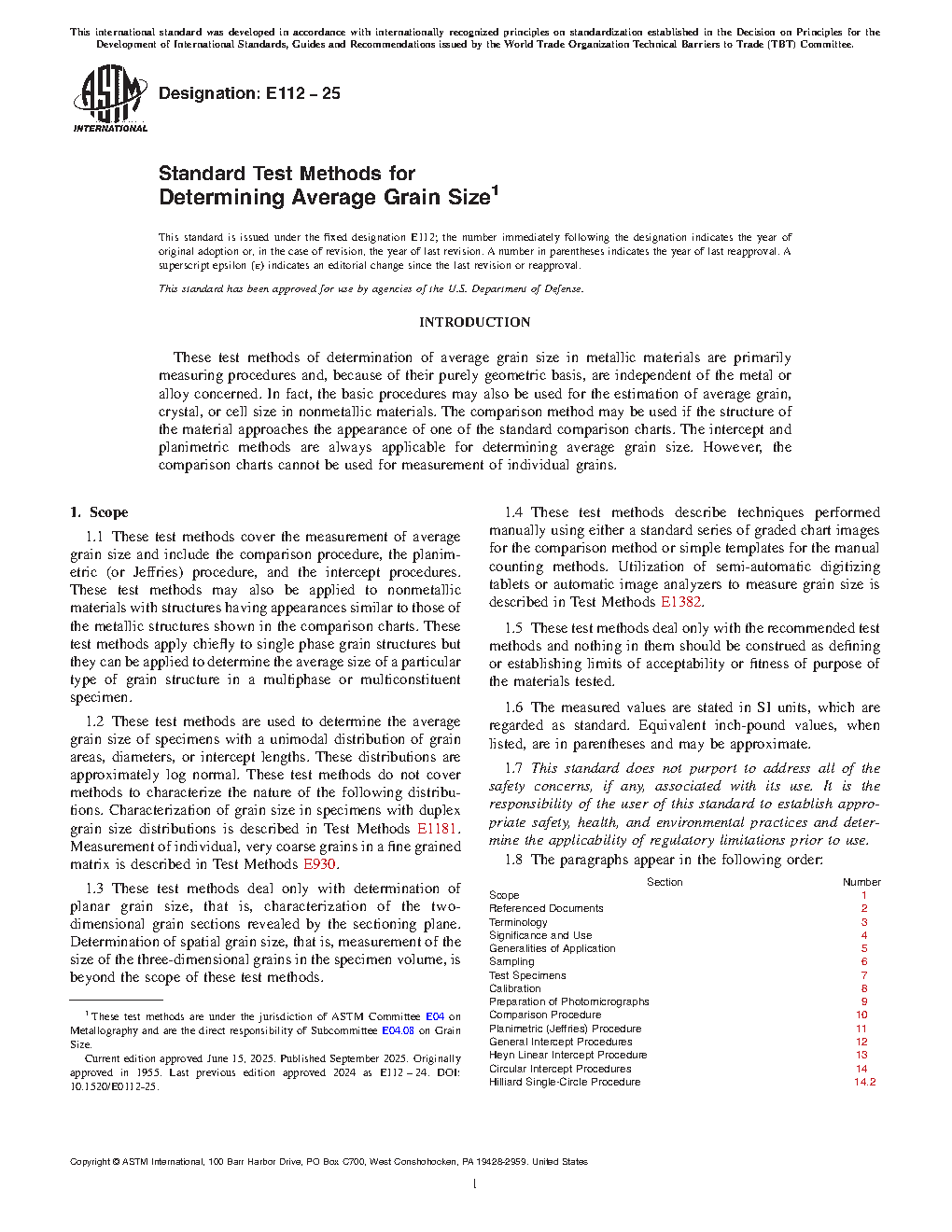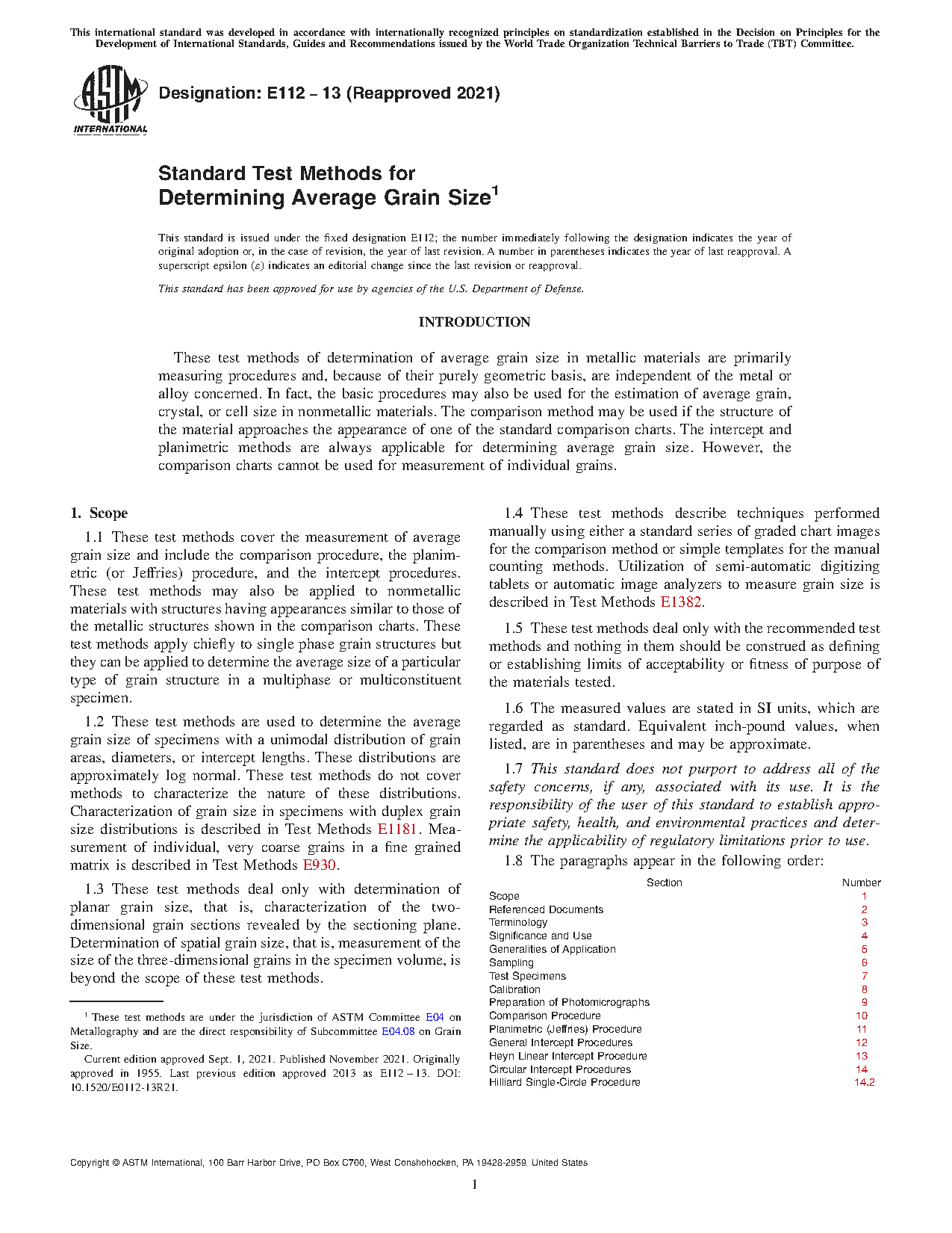 1.1 These test methods cover the measurement of average grain size and include the comparison procedure, the planimetric (or Jeffries) procedure, and the intercept procedures. These test methods may also be applied to nonmetallic materials with structures having appearances similar to those of the metallic structures shown in the comparison charts. These test methods apply chiefly to single phase grain structures but they can be applied to determine the average size of a particular type of grain structure in a multiphase or multiconstituent specimen.