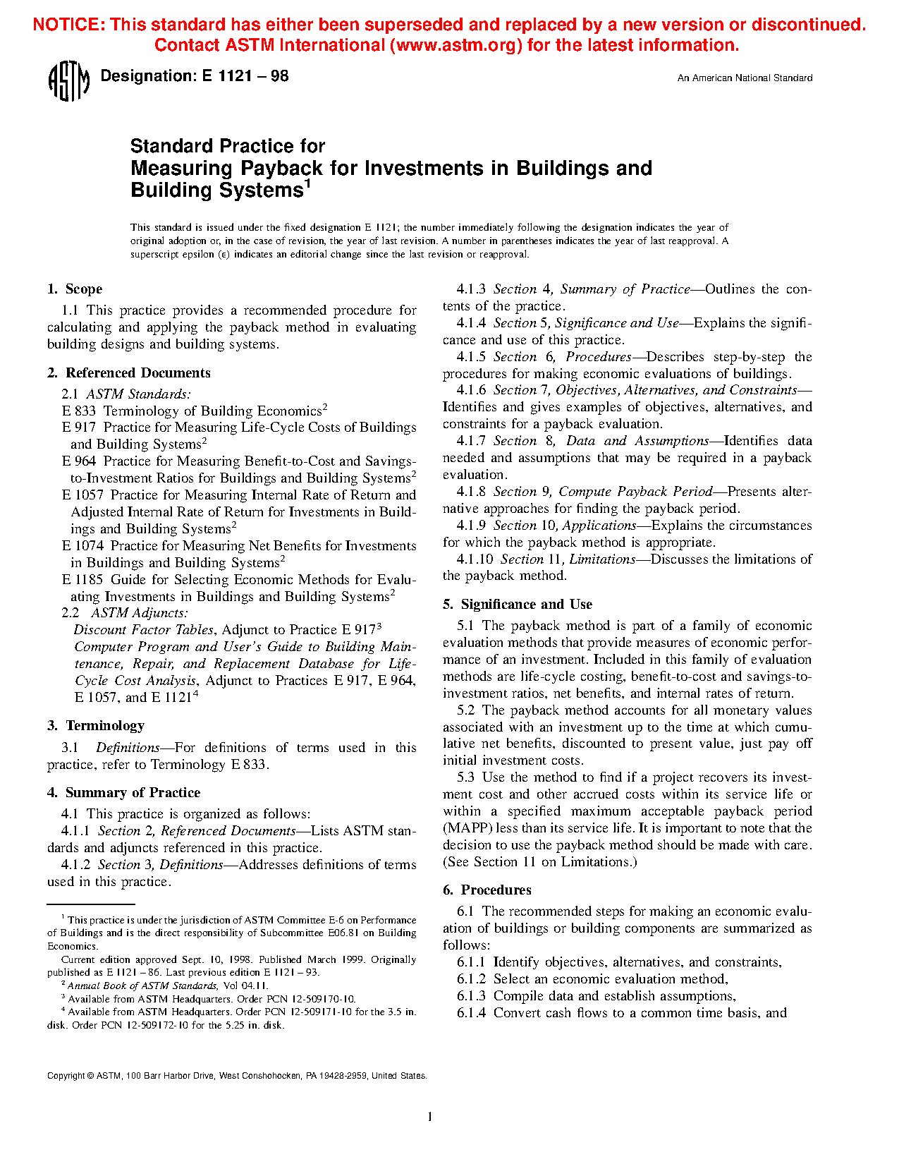 1.1 This practice provides a recommended procedure for calculating and applying the payback method in evaluating building designs and building systems.