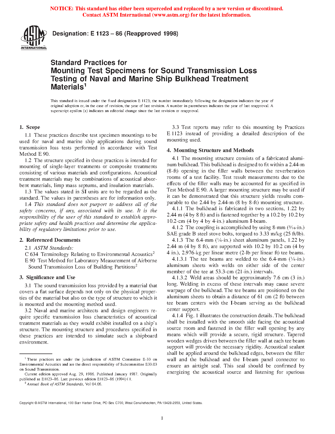 3.2 Naval and marine architects and design engineers require specific transmission loss characteristics of acoustical treatment materials as they would exhibit installed on a ship's structure. The mounting structure and procedures specified in these practices are intended to simulate such a shipboard environment.