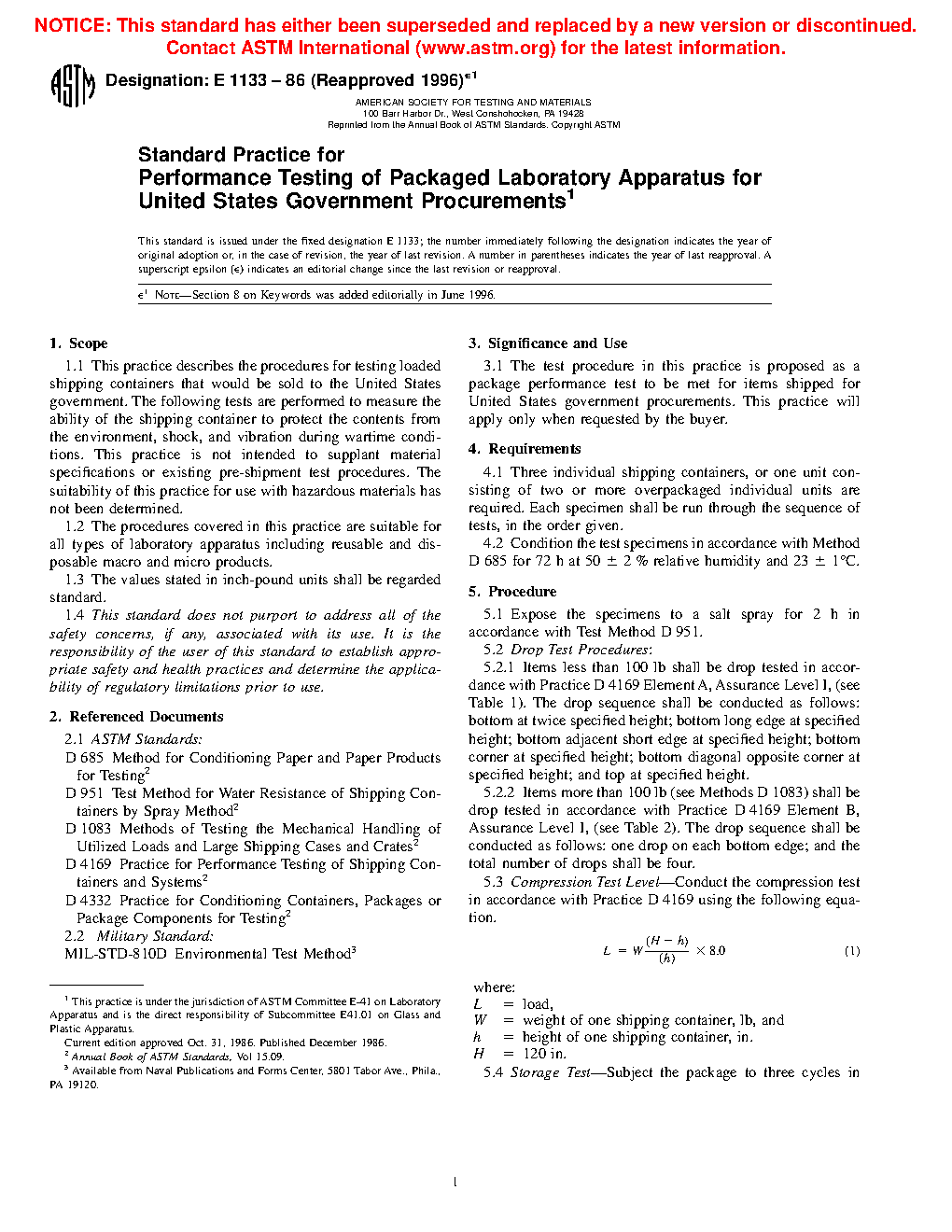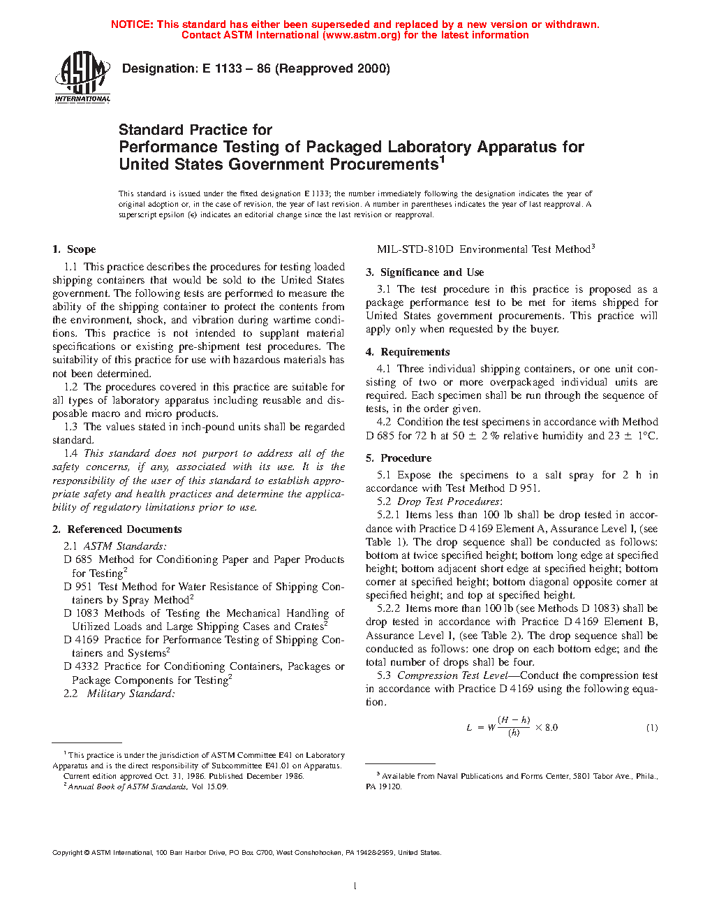 1.1 This practice describes the procedures for testing loaded shipping containers that would be sold to the United States government. The following tests are performed to measure the ability of the shipping container to protect the contents from the environment, shock, and vibration during wartime conditions. This practice is not intended to supplant material specifications or existing pre-shipment test procedures. The suitability of this practice for use with hazardous materials has not been determined.