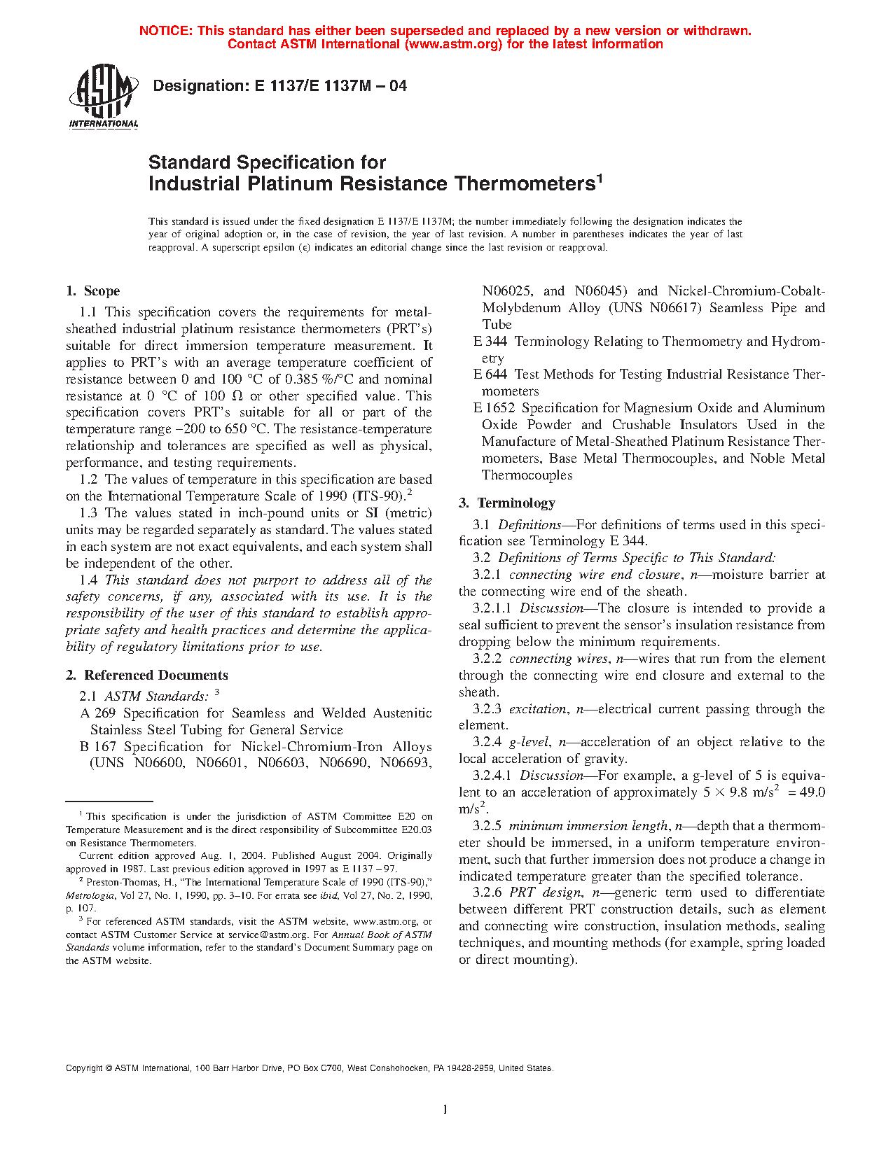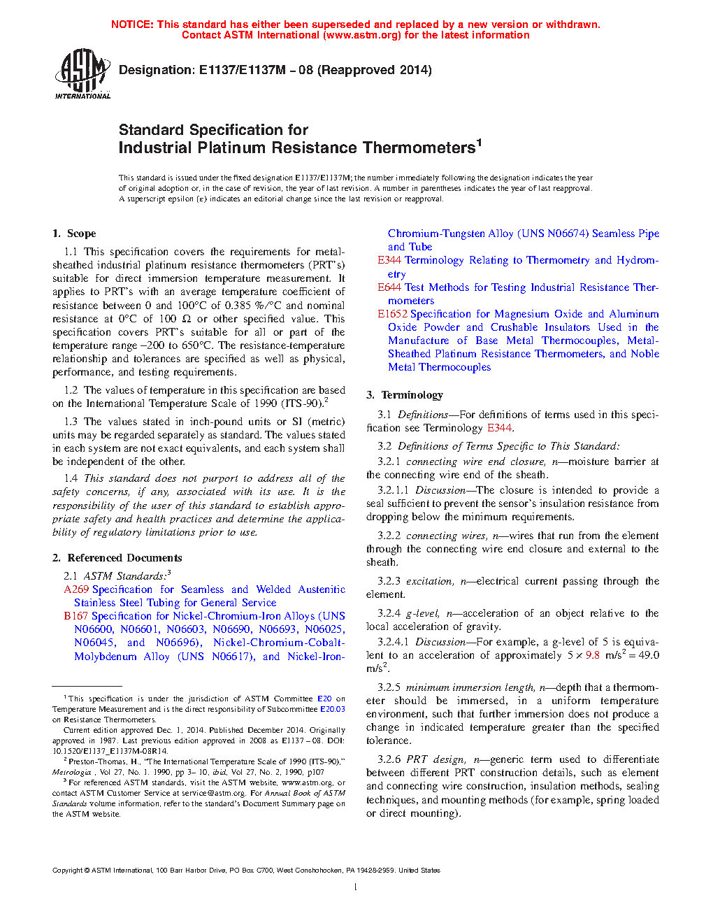 1.1 This specification covers the requirements for metal-sheathed industrial platinum resistance thermometers (PRT's) suitable for direct immersion temperature measurement. It applies to PRT's with an average temperature coefficient of resistance between 0 and 100 °C of 0.385 %/°C and nominal resistance at 0 °C of 100 Ω or other specified value. This specification covers PRT's suitable for all or part of the temperature range −200 to 650 °C. The resistance-temperature relationship and tolerances are specified as well as physical, performance, and testing requirements.