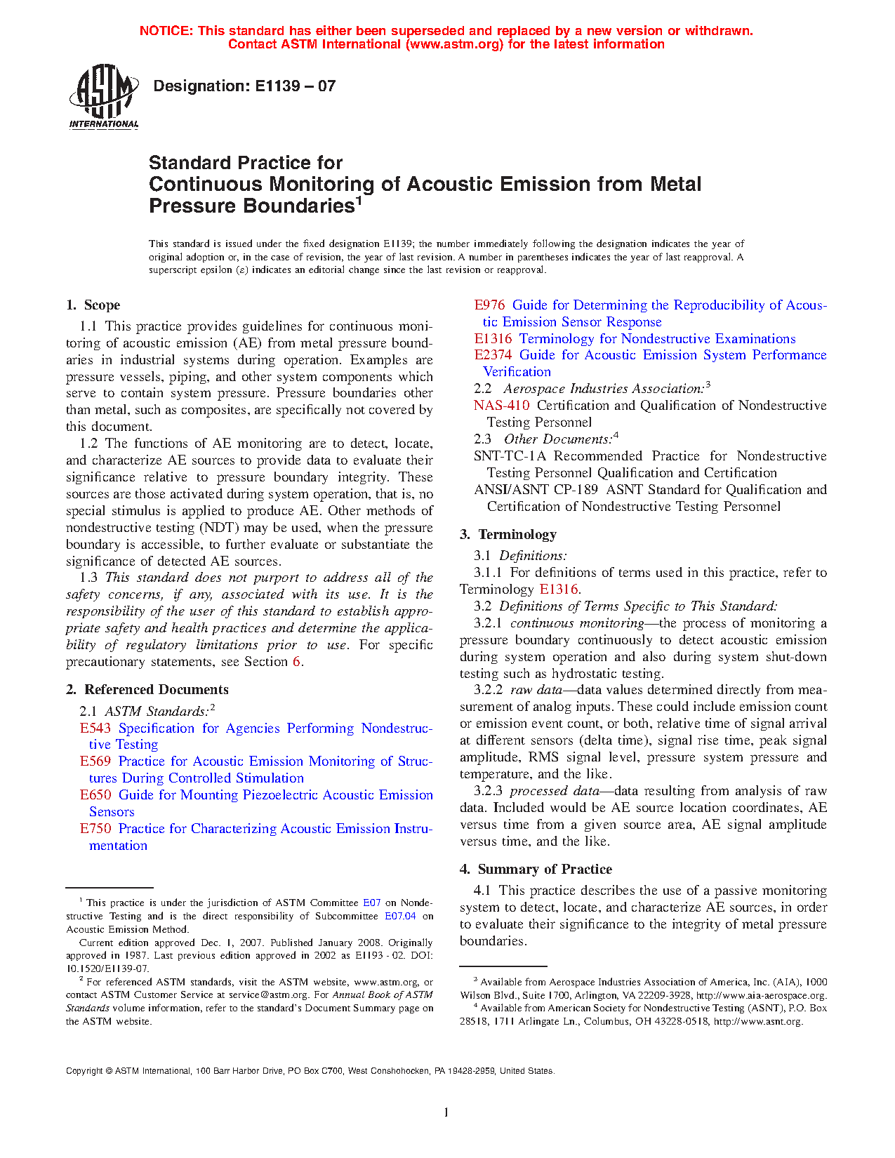 1.2 The functions of AE monitoring are to detect, locate, and characterize AE sources to provide data to evaluate their significance relative to pressure boundary integrity. These sources are those activated during system operation, that is, no special stimulus is applied to produce AE. Other methods of nondestructive testing (NDT) may be used, when the pressure boundary is accessible, to further evaluate or substantiate the significance of detected AE sources.
