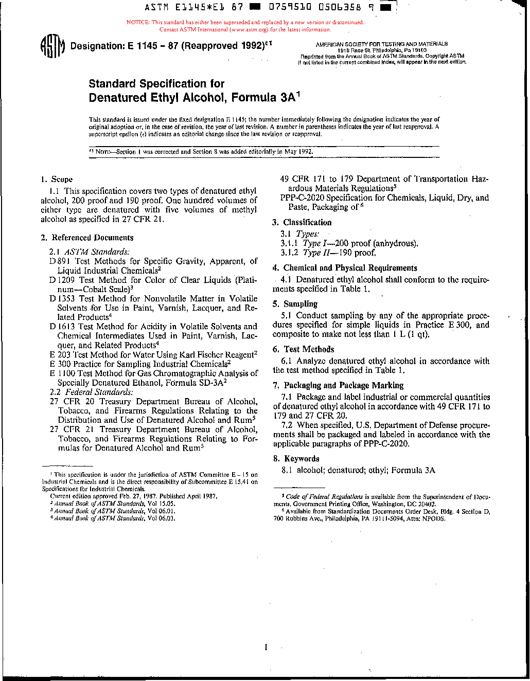 Specification for Denatured Ethyl Alcohol, Formula 3A (Withdrawn 1993)