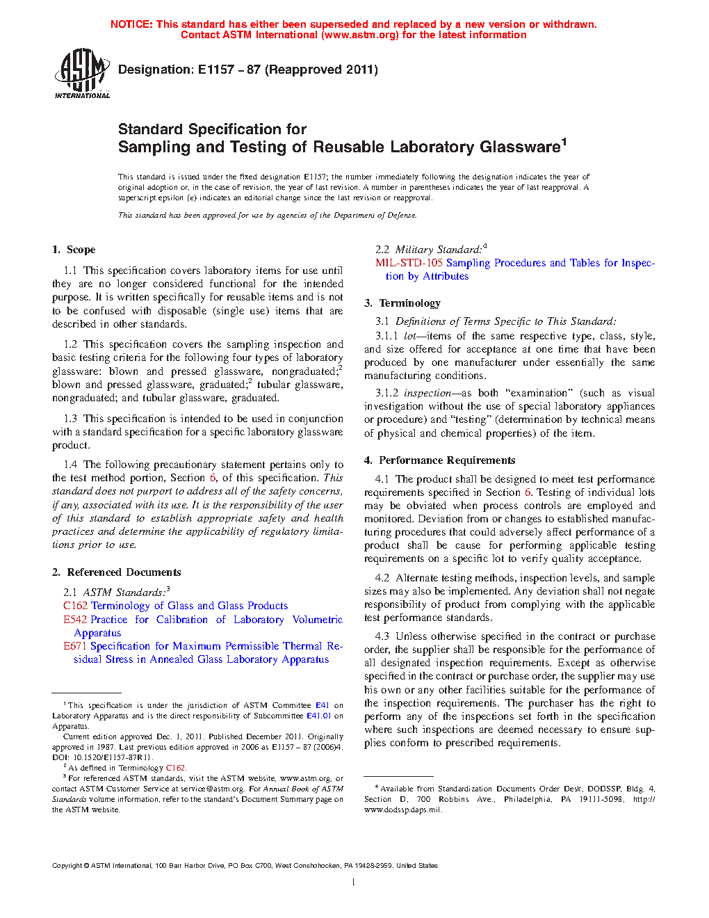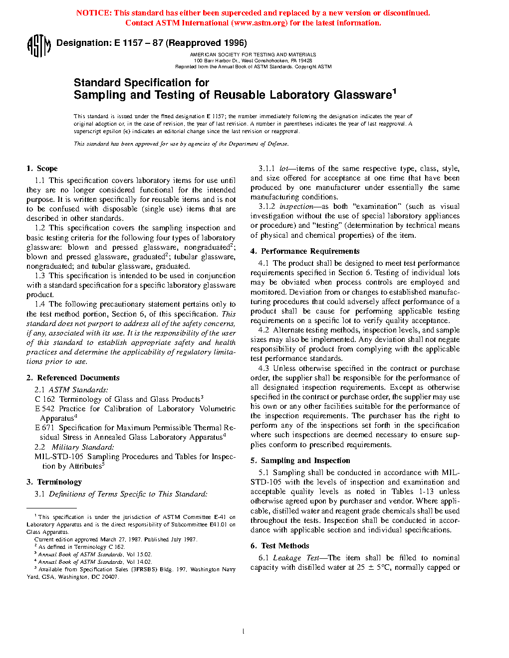 This specification covers sampling and testing of laboratory glassware items for use until they are no longer considered functional for the intended purpose, and does not include disposable (single use) items. Four types of reusable laboratory glassware are covered, namely: blown and pressed glassware, nongraduated; blown and pressed glassware, graduated; tubular glassware, nongraduated; and tubular glassware, graduated. The product shall be designed to meet the specified test performance requirements. Alternate testing methods, inspection levels, and sample sizes may be implemented. Sampling shall be conducted in accordance with the specified inspection and examination levels and acceptance quality levels for major defects, minor defects, and dimensional examination. Where applicable, distilled water and reagent grade chemicals shall be used throughout the tests. Inspection shall be conducted in accordance with applicable section and individual specifications. The basic testing criteria for the following tests are detailed: (1) leakage test, (2) permanency of marking by alkali and acid tests, (3) capacity fill test, (4) autoclaving, (5) pour test, and (6) centrifugal test.