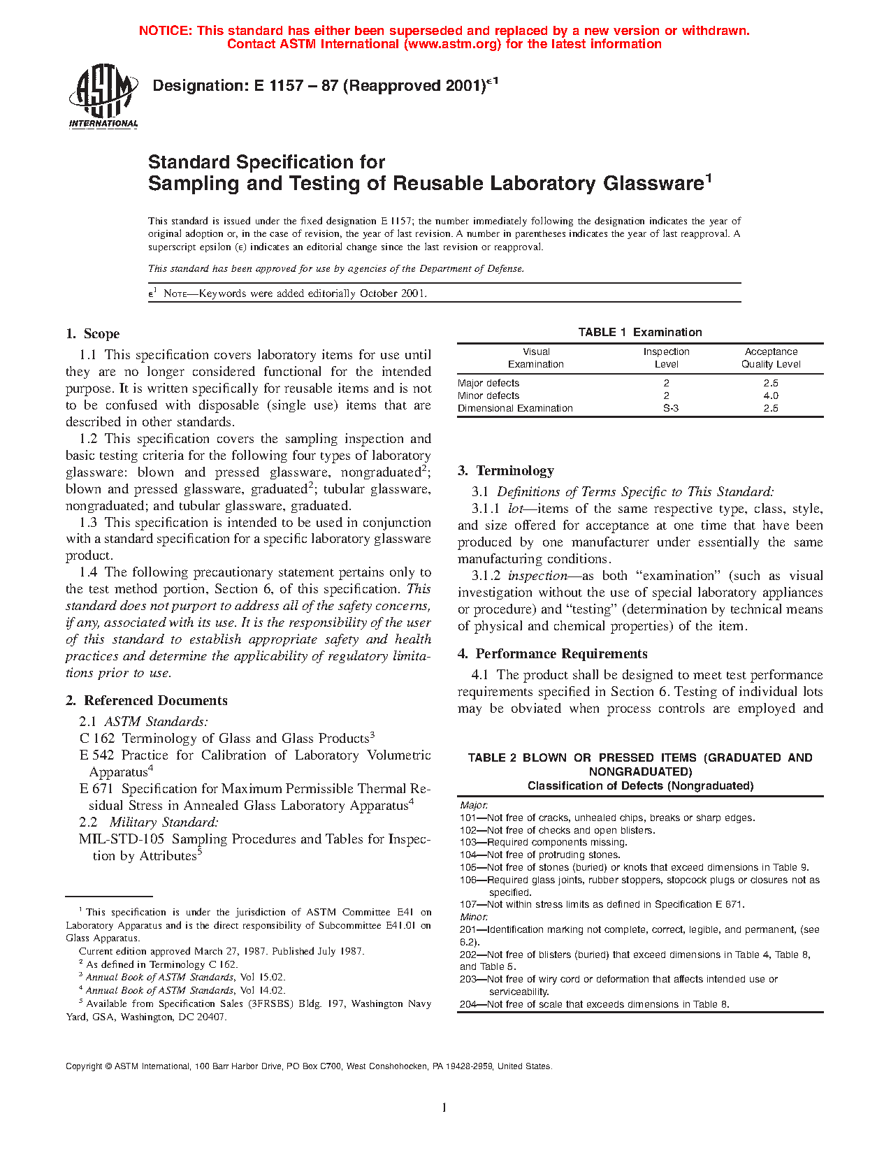 1.2 This specification covers the sampling inspection and basic testing criteria for the following four types of laboratory glassware: blown and pressed glassware, nongraduated;2 blown and pressed glassware, graduated;2 tubular glassware, nongraduated; and tubular glassware, graduated.
