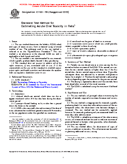 1.1 This test method determines the lethality (LD50 value) and signs of acute toxicity from a material using a limited number of rats. The technique used in this test method is referred to as the "Up-and-Down Procedure." This test method is an alternative to the classical LD50 test and is applicable to both liquids and solids.