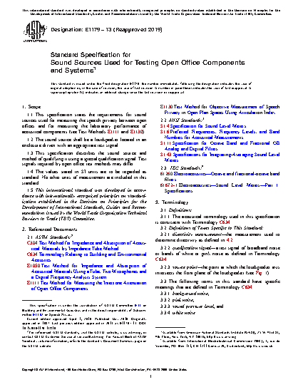 1.1 This specification states the requirements for sound sources used for measuring the speech privacy between open offices or for measuring the laboratory performance of acoustical components (see Test Methods E 1111 and E 1130).