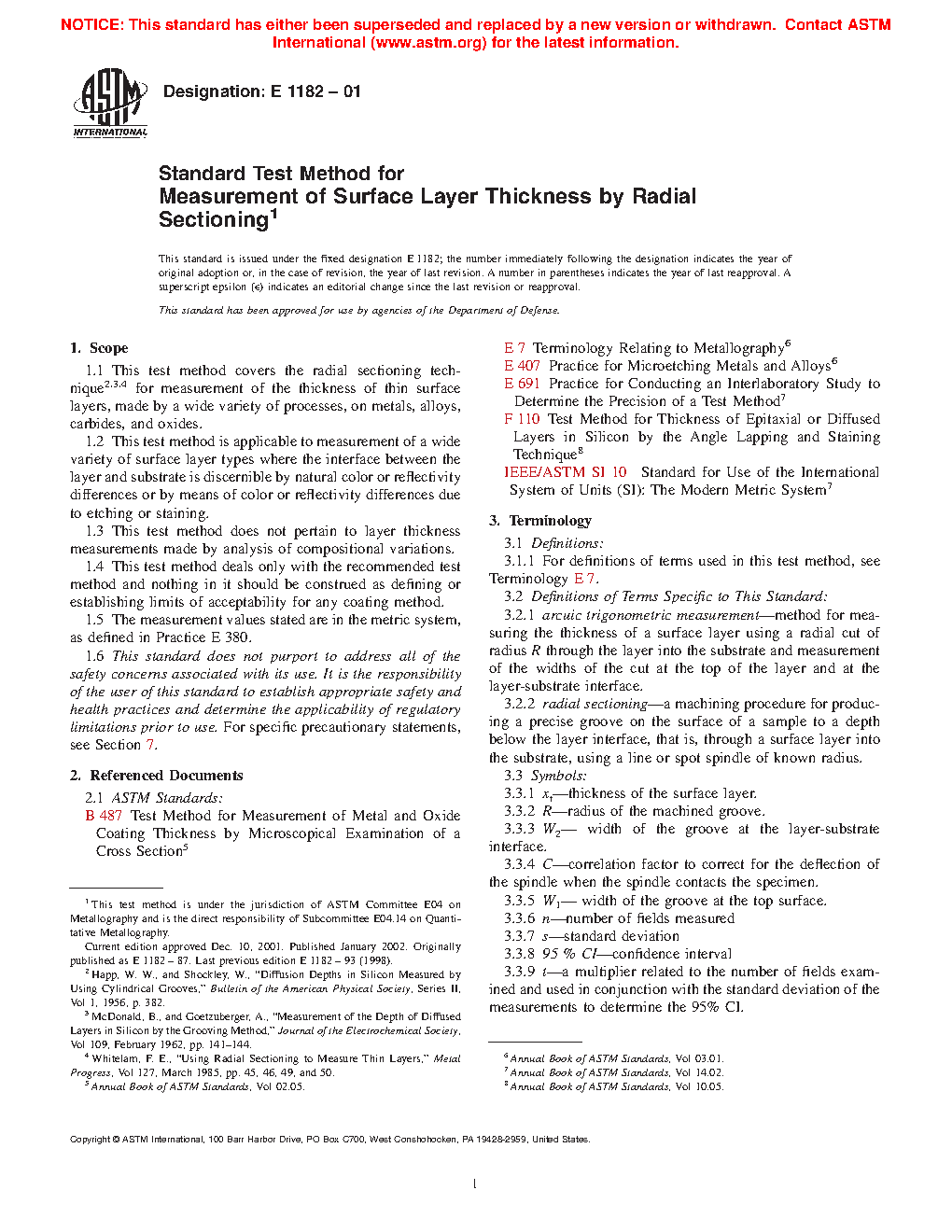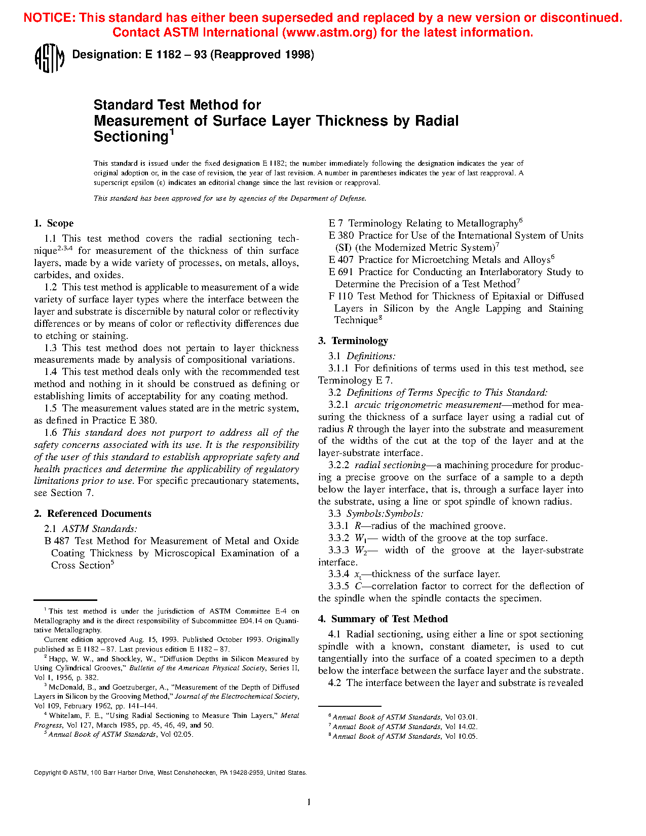 1.1 This test method covers the radial sectioning technique 2,3,4 for measurement of the thickness of thin surface layers, made by a wide variety of processes, on metals, alloys, carbides, and oxides.
