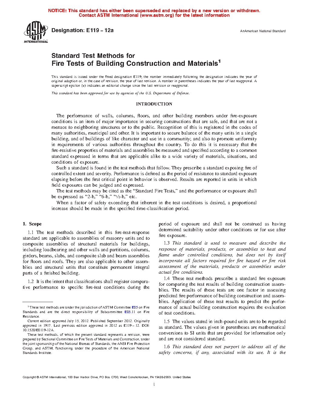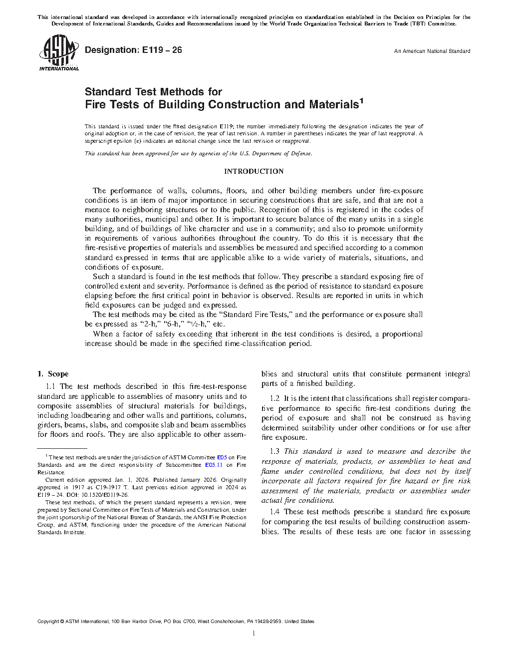1.1 The test methods described in this fire-test-response standard are applicable to assemblies of masonry units and to composite assemblies of structural materials for buildings, including loadbearing and other walls and partitions, columns, girders, beams, slabs, and composite slab and beam assemblies for floors and roofs. They are also applicable to other assemblies and structural units that constitute permanent integral parts of a finished building.