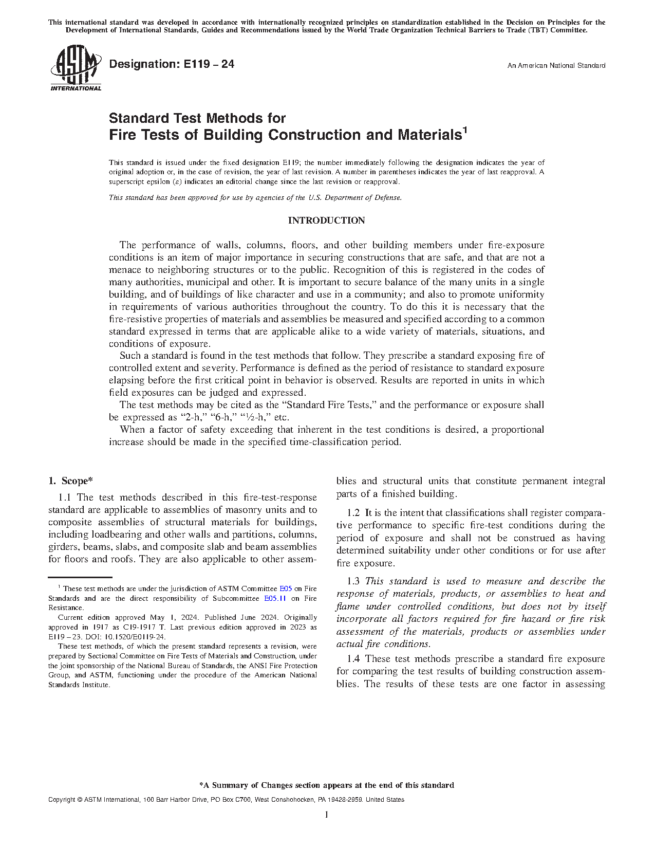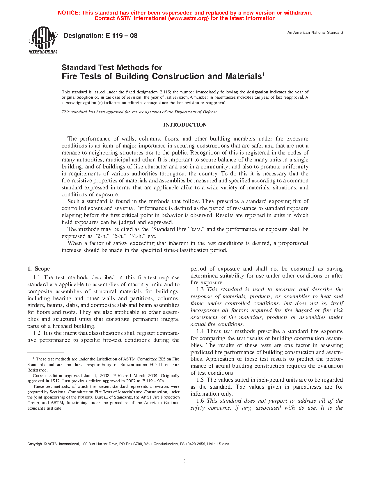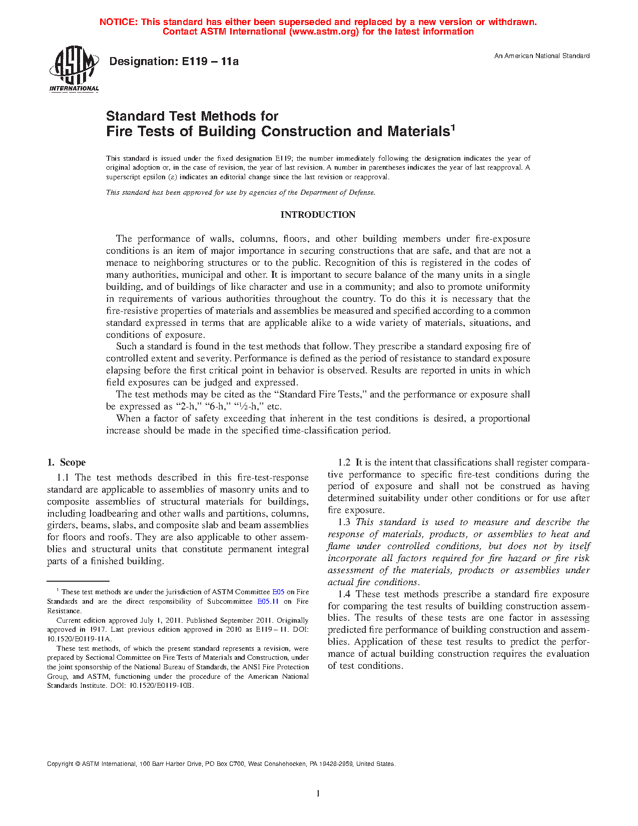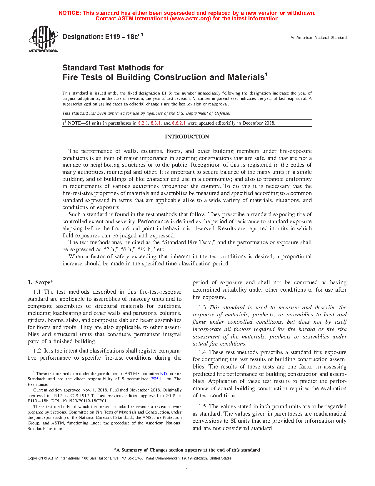 1.1 The test methods described in this fire-test-response standard are applicable to assemblies of masonry units and to composite assemblies of structural materials for buildings, including loadbearing and other walls and partitions, columns, girders, beams, slabs, and composite slab and beam assemblies for floors and roofs. They are also applicable to other assemblies and structural units that constitute permanent integral parts of a finished building.