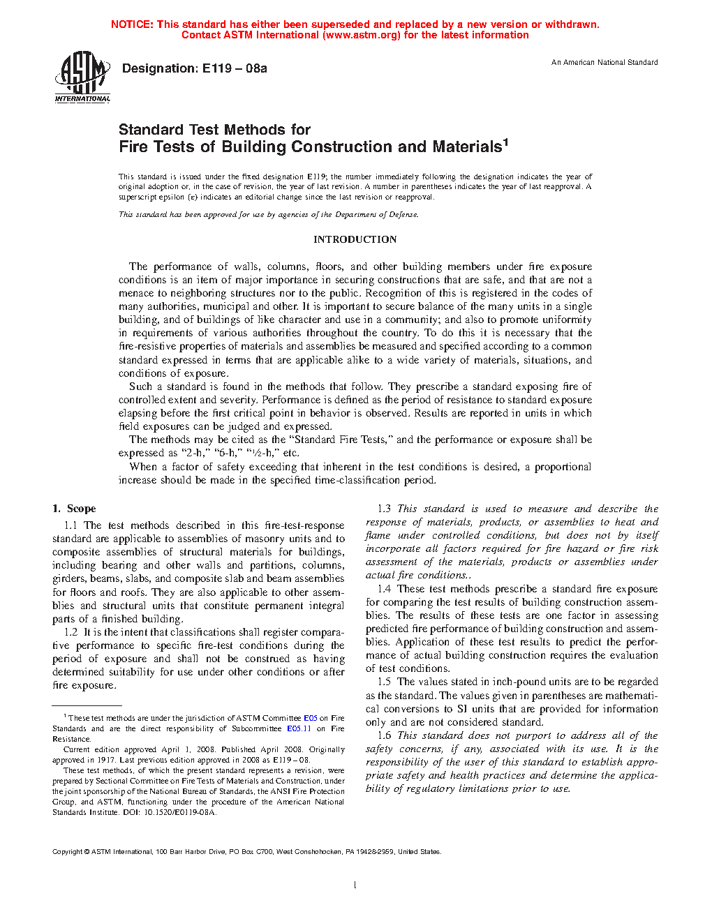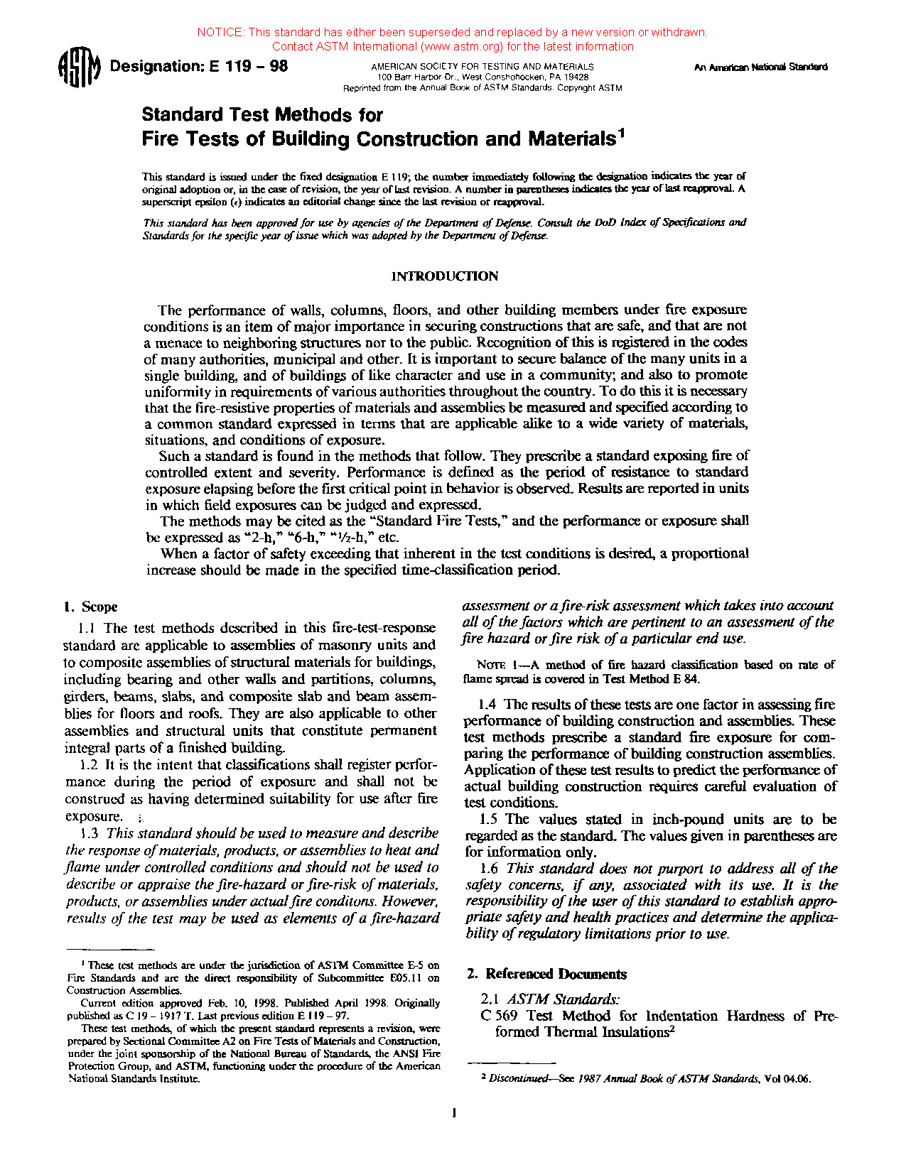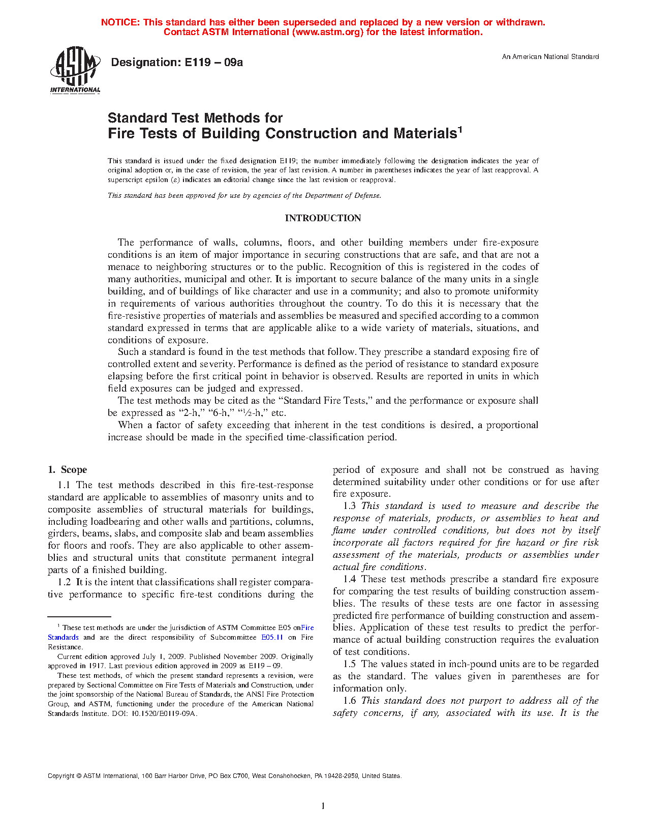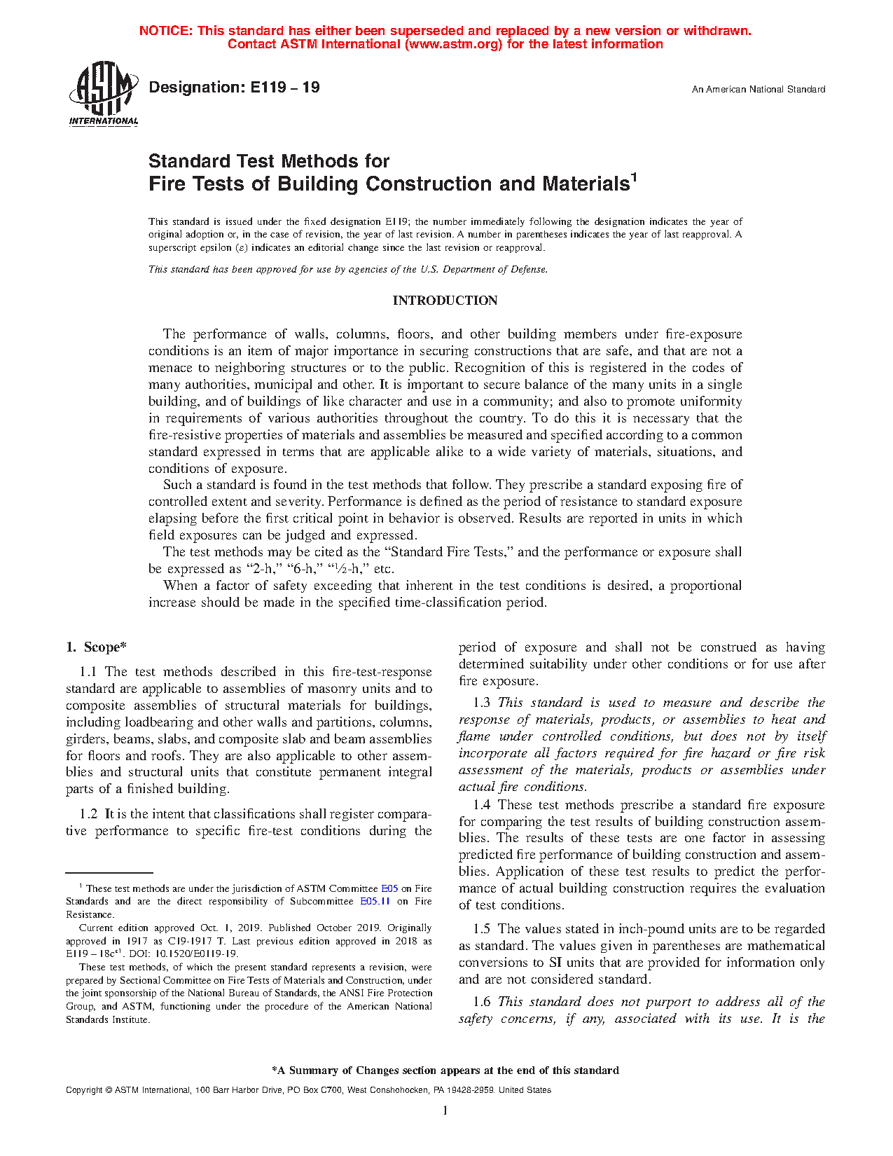 1.1 The test methods described in this fire-test-response standard are applicable to assemblies of masonry units and to composite assemblies of structural materials for buildings, including loadbearing and other walls and partitions, columns, girders, beams, slabs, and composite slab and beam assemblies for floors and roofs. They are also applicable to other assemblies and structural units that constitute permanent integral parts of a finished building.